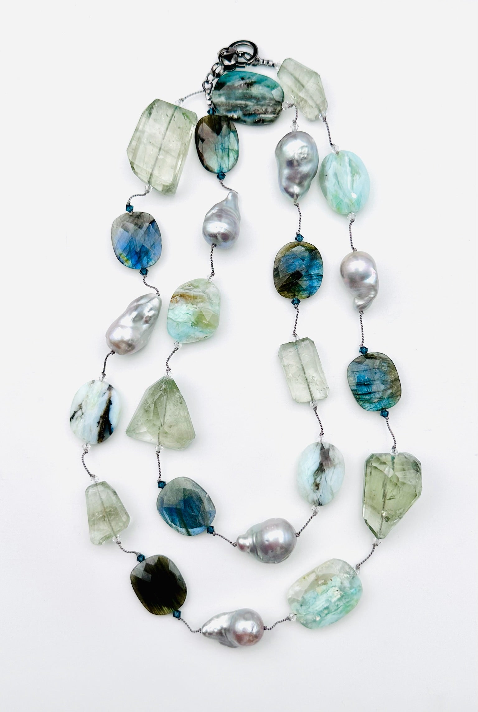 36" Faceted Peruvian Opal, Labradorite, Green Amethyst and Grey Baroque Pearl Necklace