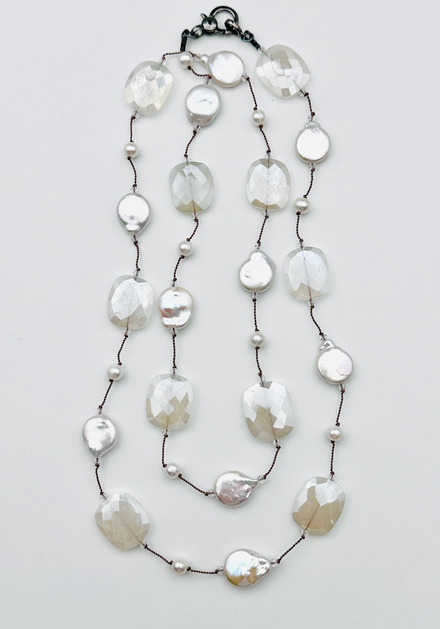 36" Flat Faceted Square Coated Rainbow Moonstone and Freshwater Coin Pearl Necklace