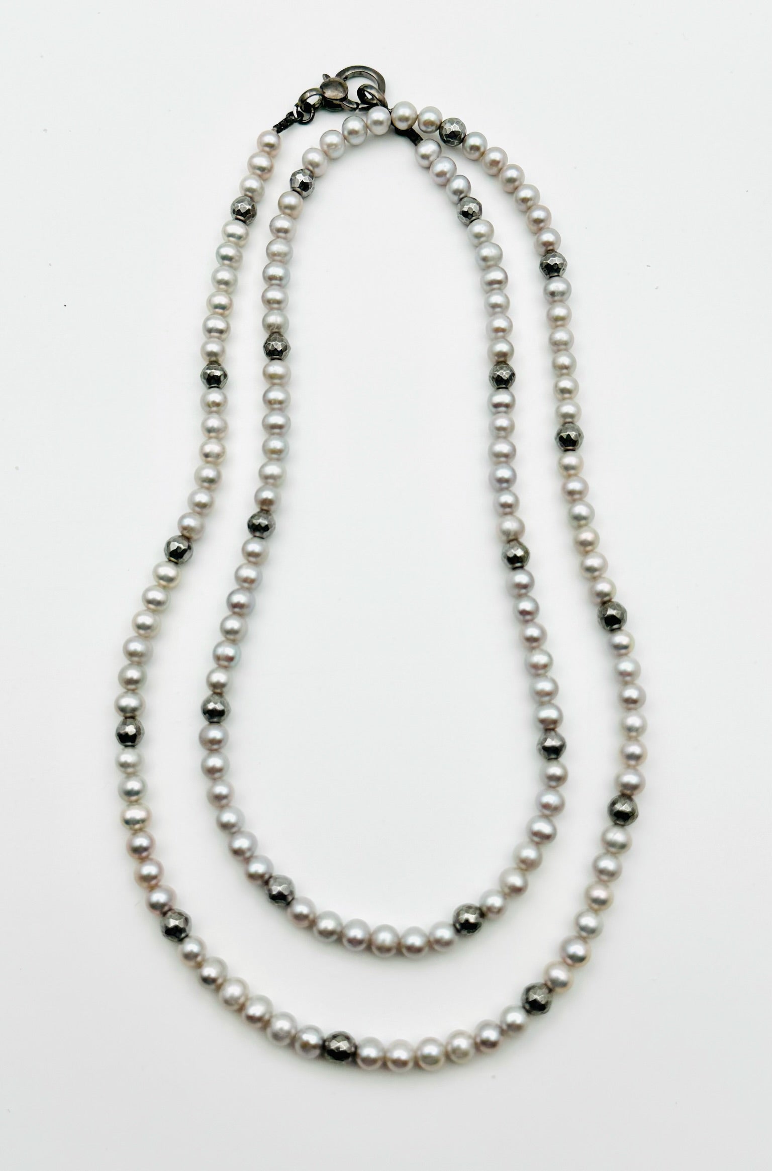 36" Grey 6mm Freshwater Pearl and Faceted Pyrite Ball Necklace with Rhodium/Sterling Silver Clasp