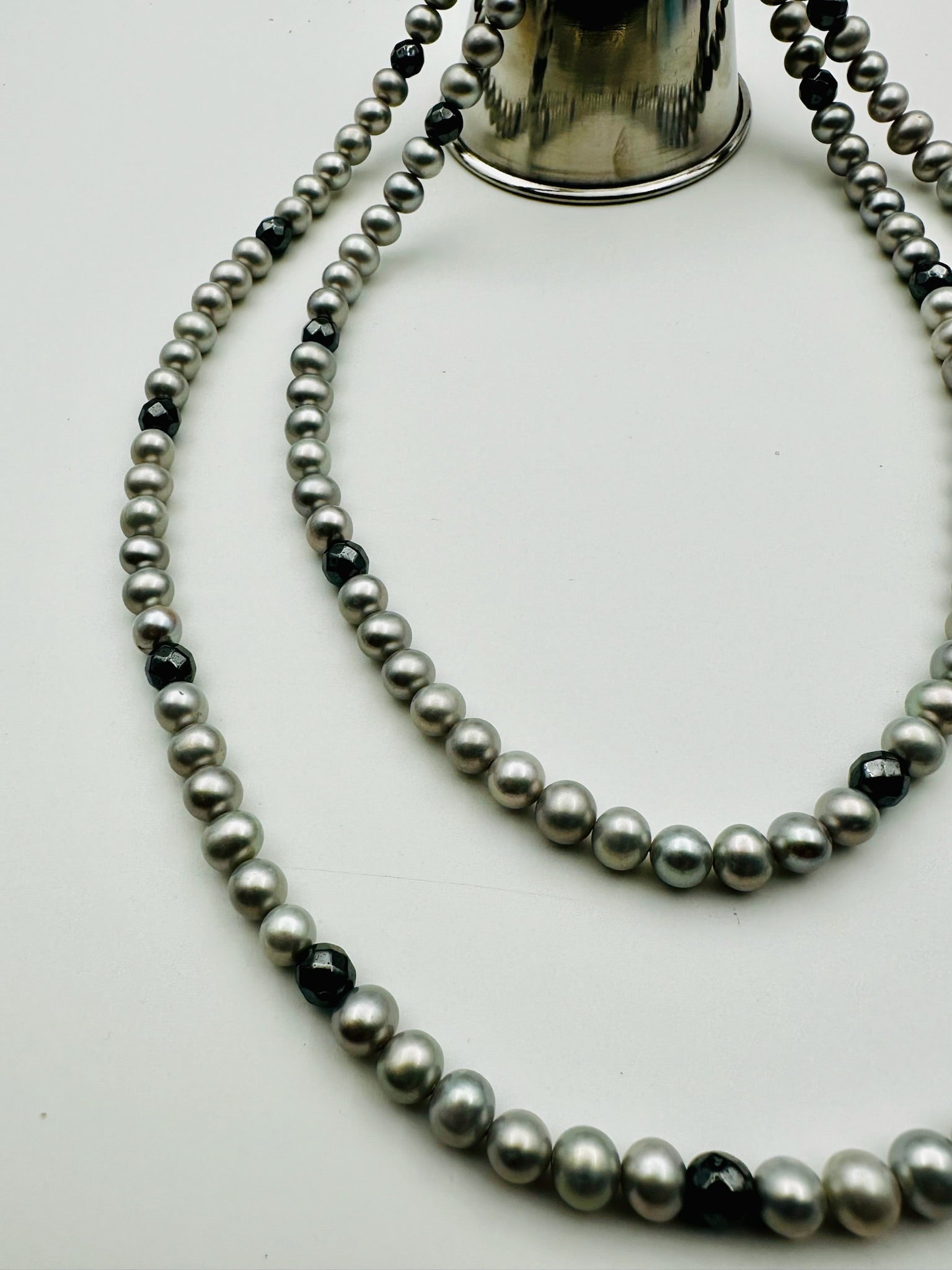 36" Grey Freshwater Pearl with Black Faceted Hematite Necklace with Rhodium Clasp