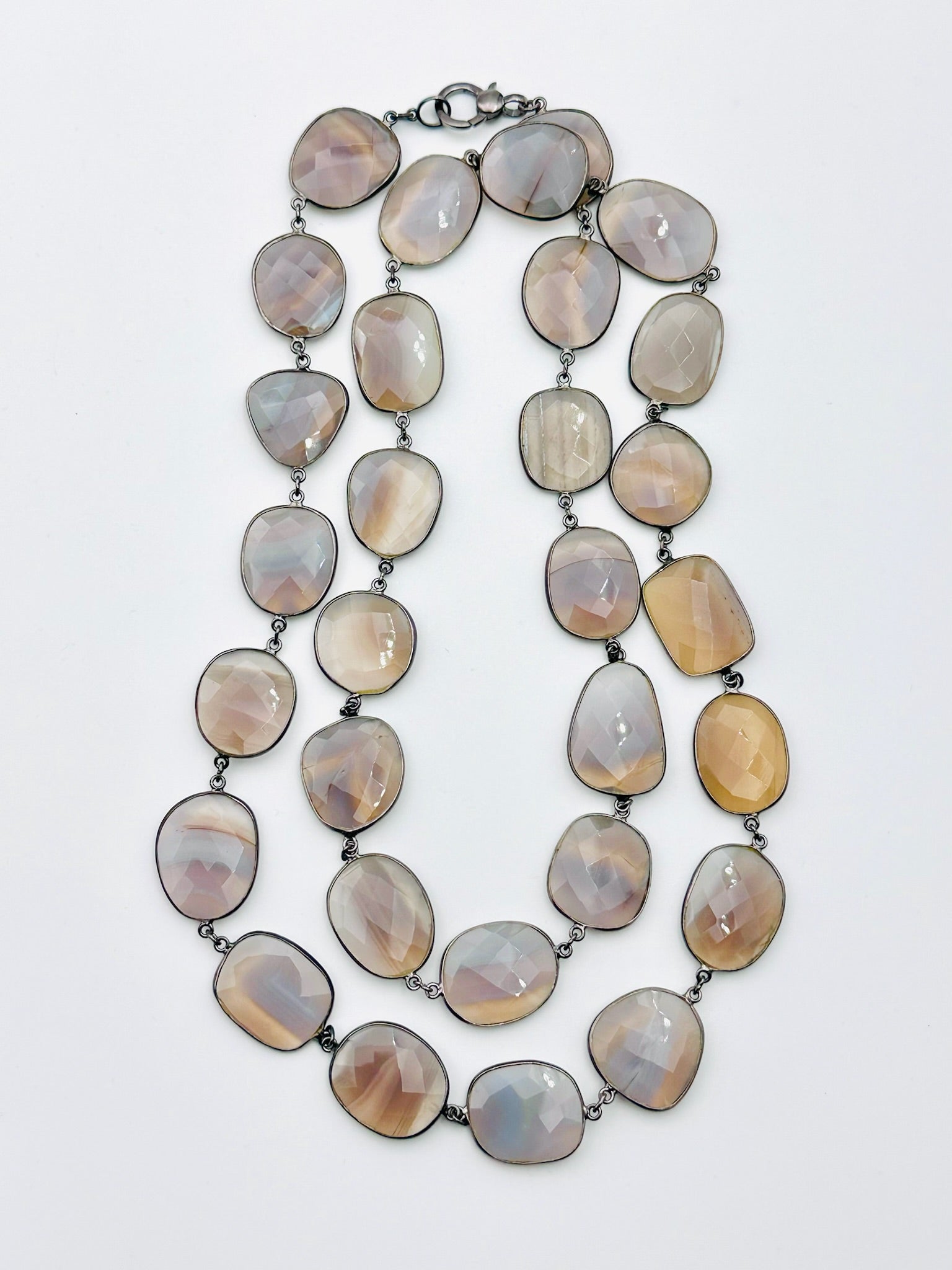 36" Large Grey Agate Necklace with Rhodium Bezel and Clasp