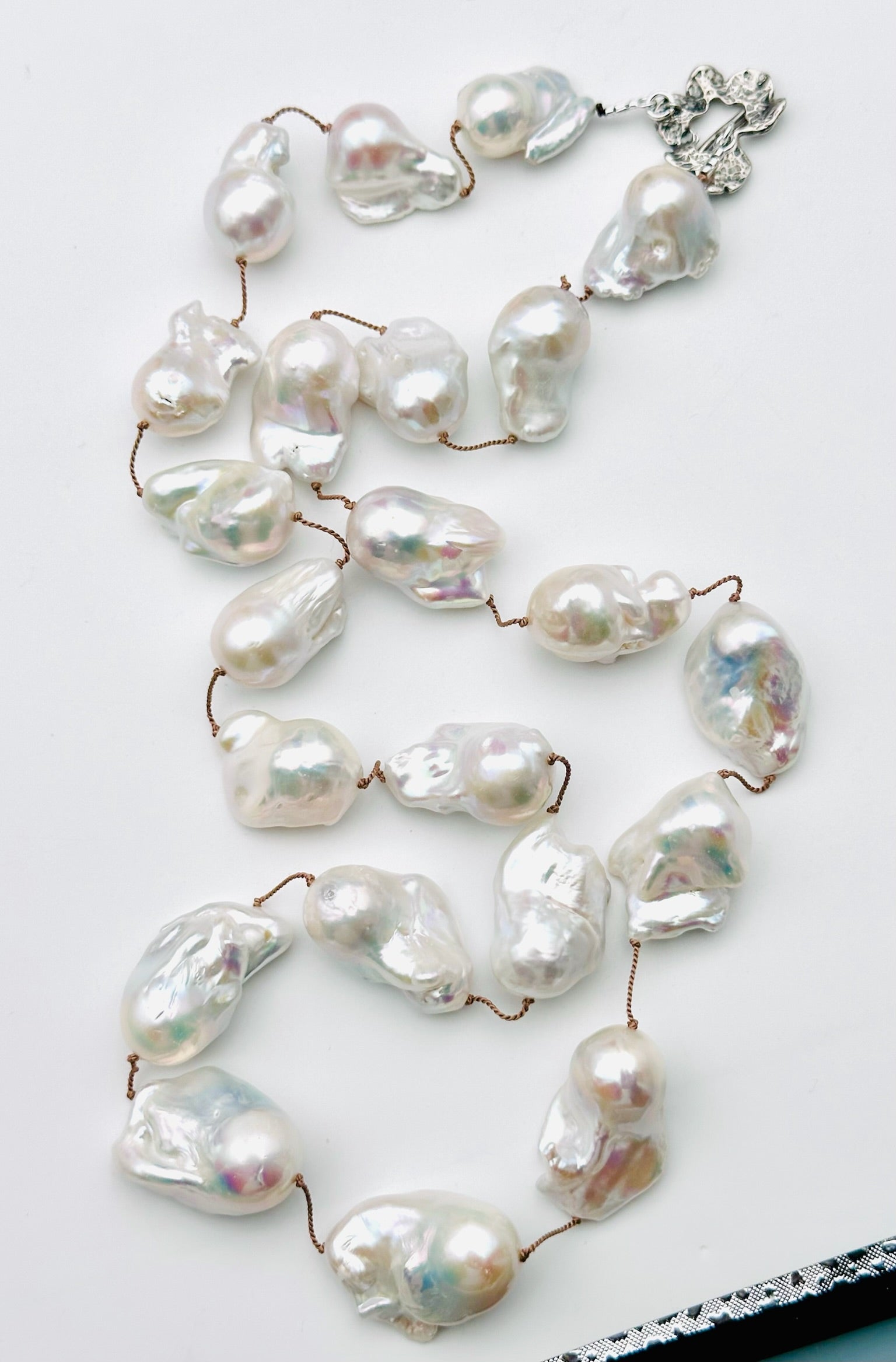 Lustrous XL Organic Shaped White Baroque Pearl with Sterling Silver Organic Shaped Toggle Closure, 36" length