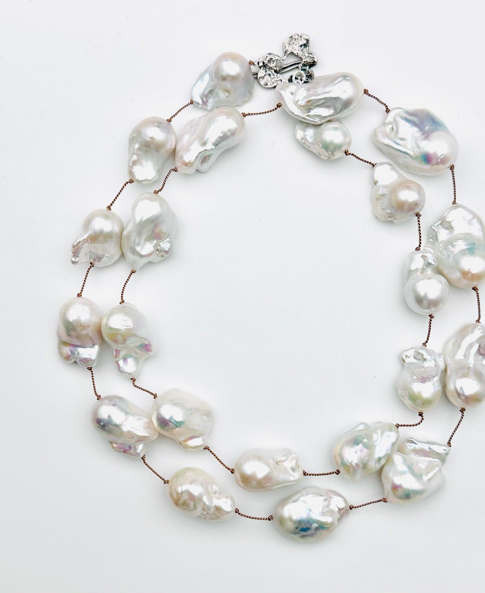 36" Lustrous Extra Large Organic Shaped White Baroque Pearl with Sterling Silver Organic Shaped Toggle Closure
