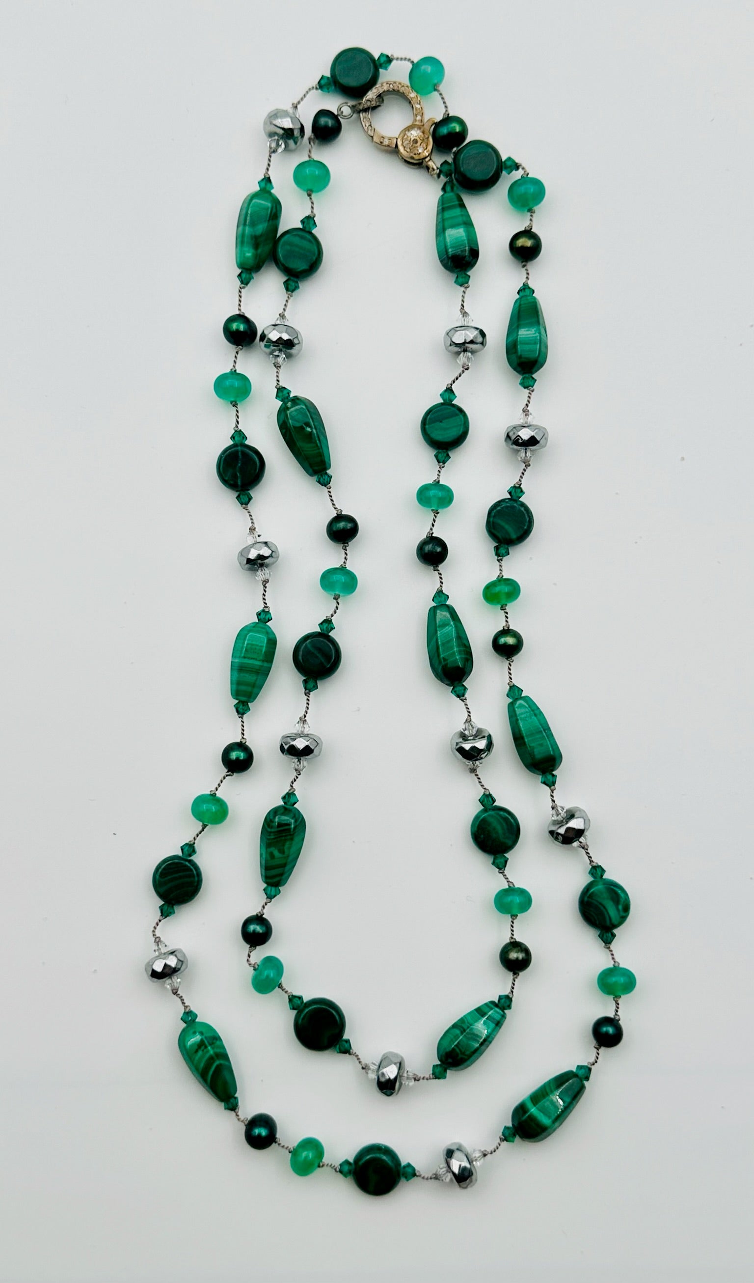 Malachite, Pyrite, Green Onyx and Green Freshwater Pearl Long Necklace with Sterling Silver, 36" length