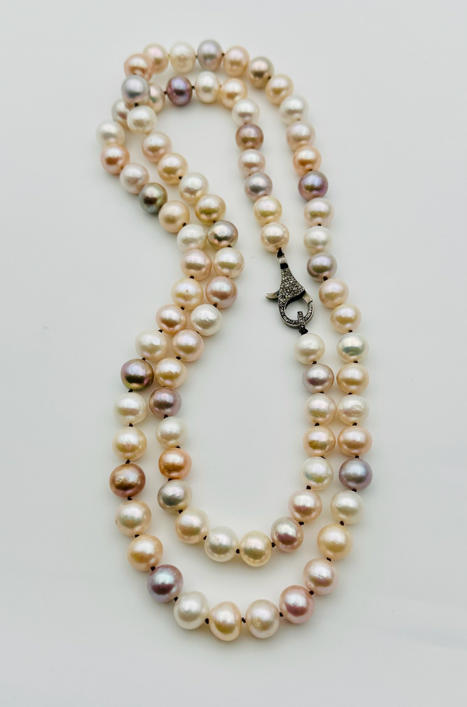 Multicolor White And Pink 10mm Round Pearls, Sterling Silver Diamond Clasp, 36" Length