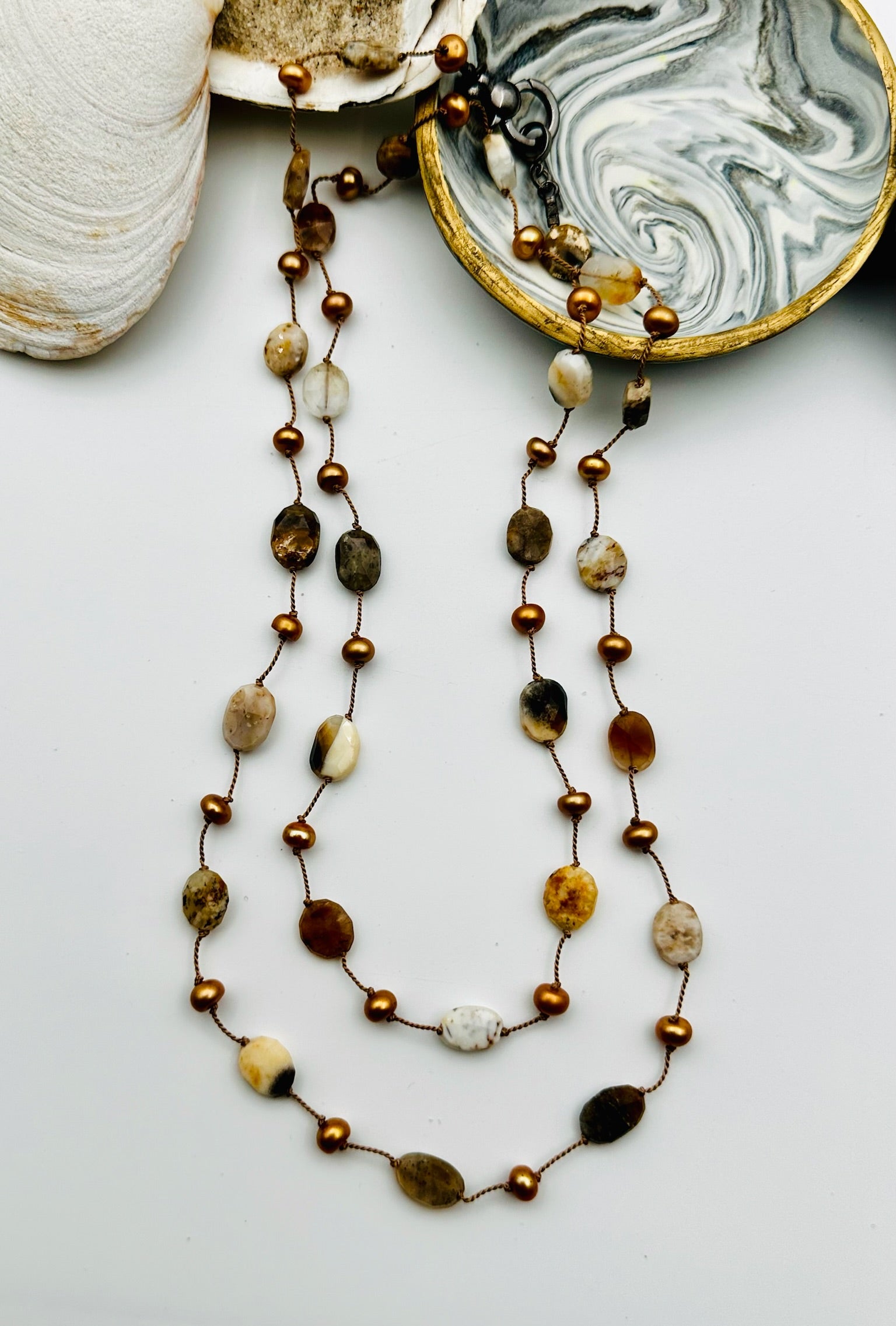 36" Neutral-Colored, Faceted Natural Opal and Tan Freshwater Pearl Necklace with Sterling Silver Clasp
