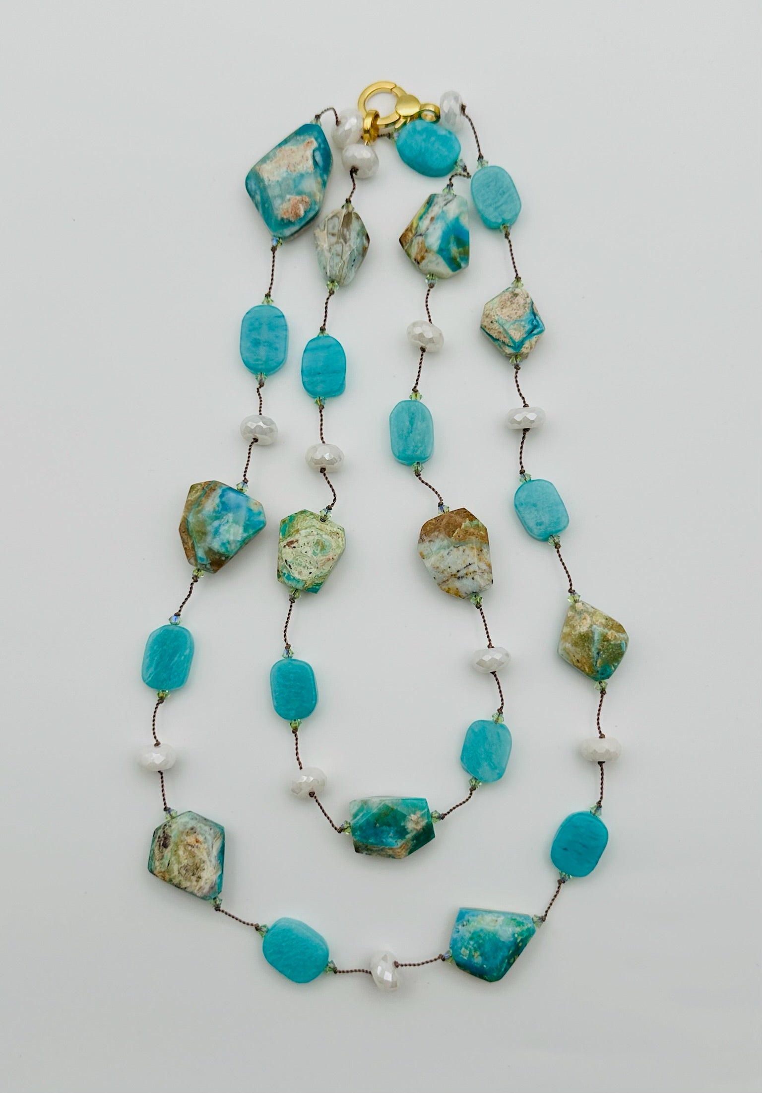 Opalina, Amazonite, Rainbow Moonstone Necklace with Gold Vermeil, 18k/sterling silver, 36" Length