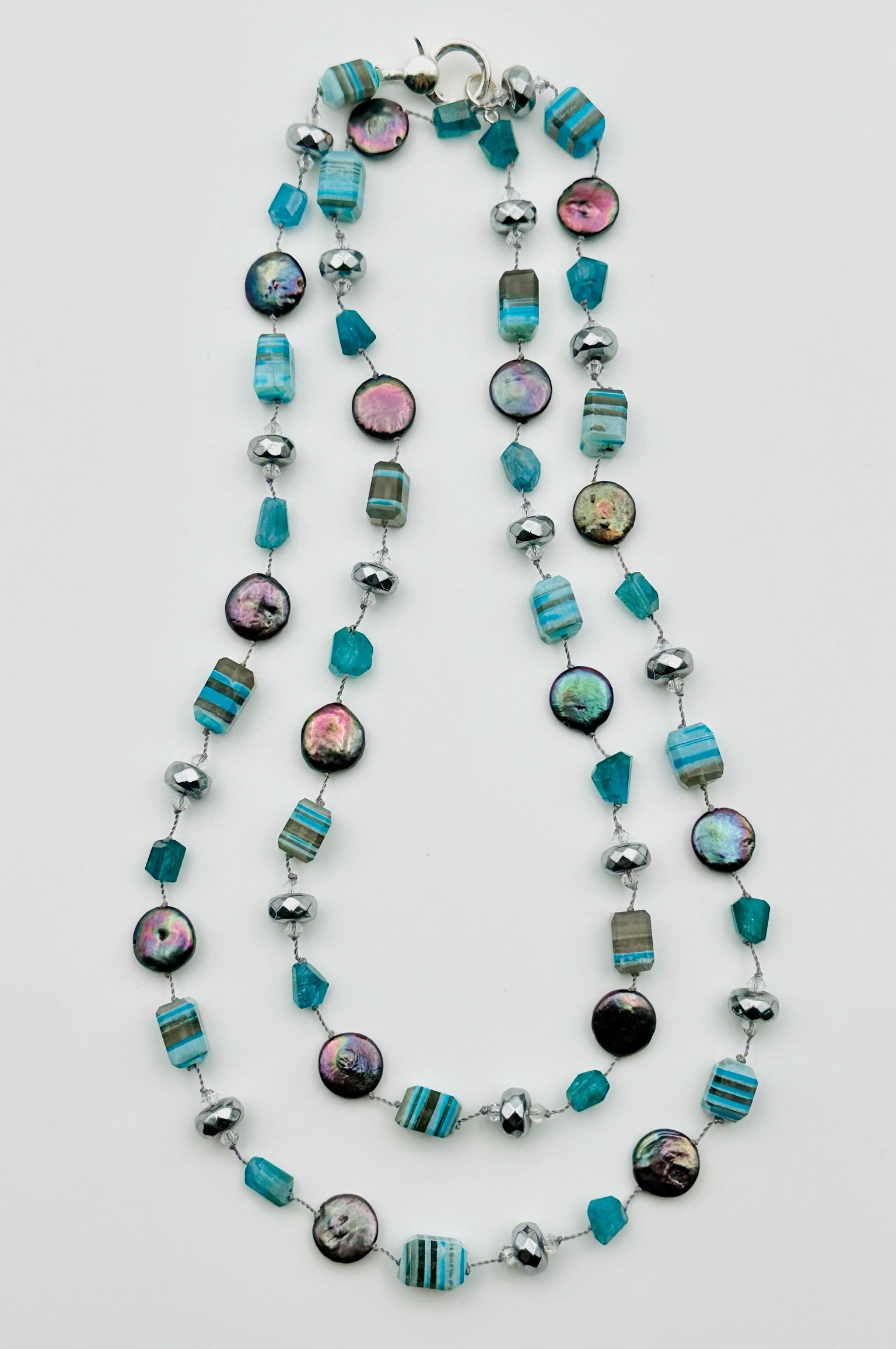 36" Peru Boulder Opal Neon Apatite Charcoal Grein Freshwater Coin and Pyrite Rondel Long Necklace with Sterling Silver