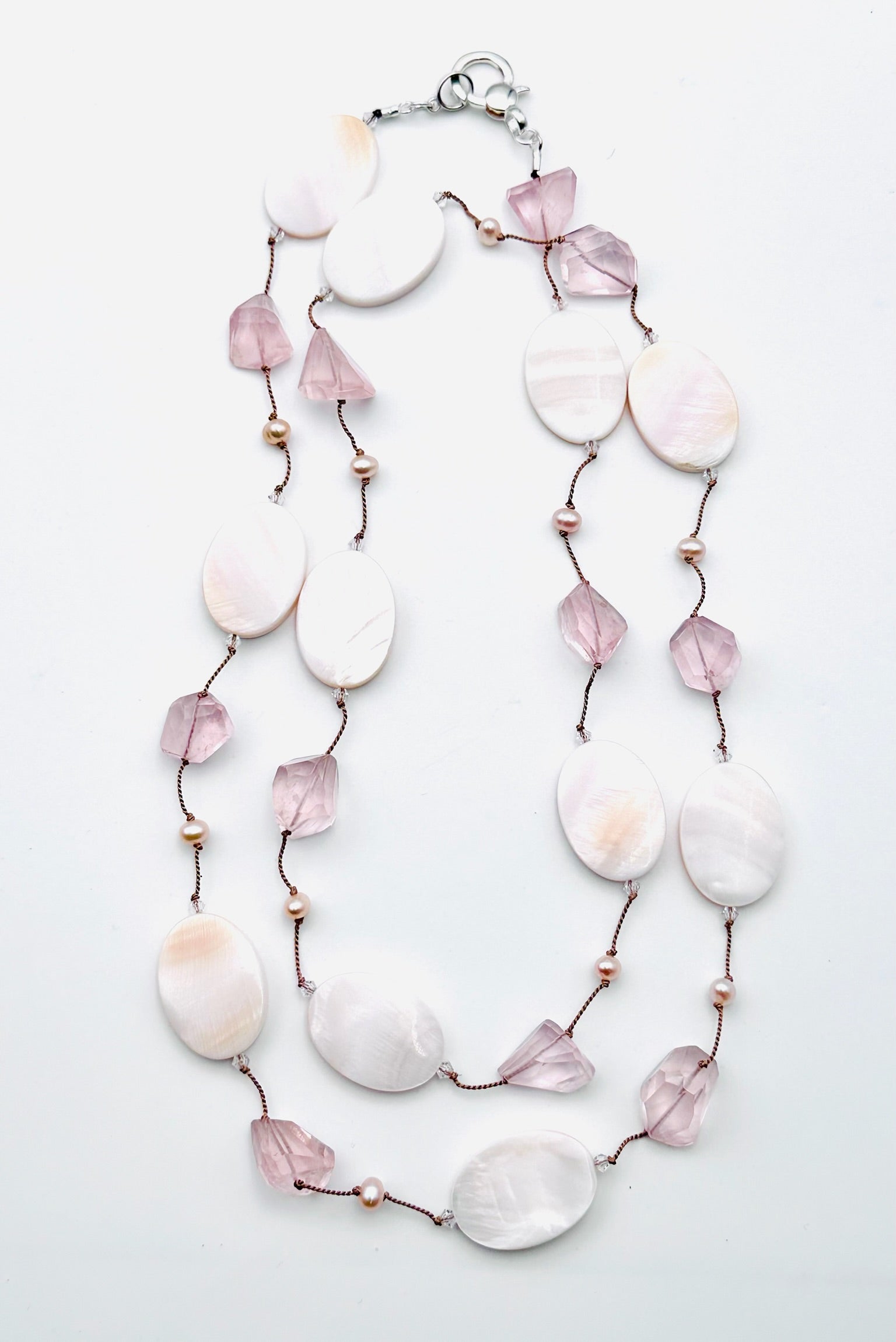 Rose Quartz, Pink Mother Of Pearl and Pink Freshwater Pearl Necklace with a Sterling Silver Clasp, 36" length