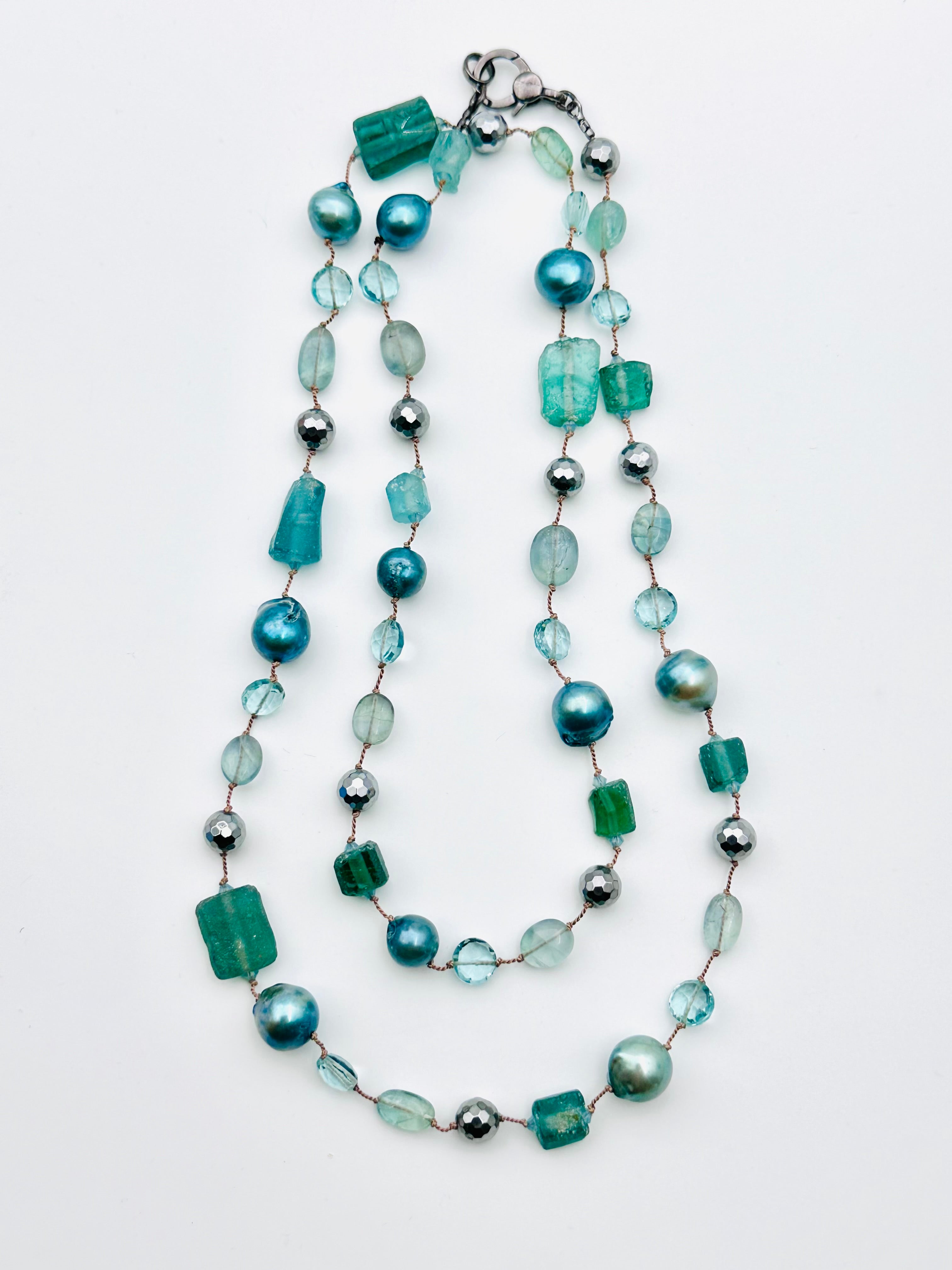 36" Teal Green Freshwater Baroque Pearl, Roman Glass, Pyrite, Fluorite, Green Topaz Necklace