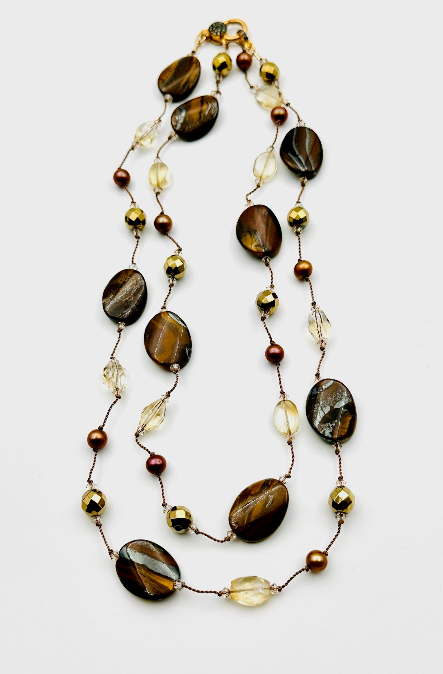 36" Tiger'S Eye Tan Freshwater Pearl Citrine Gold Pyrite Necklace with Gold Vermeil Clasp