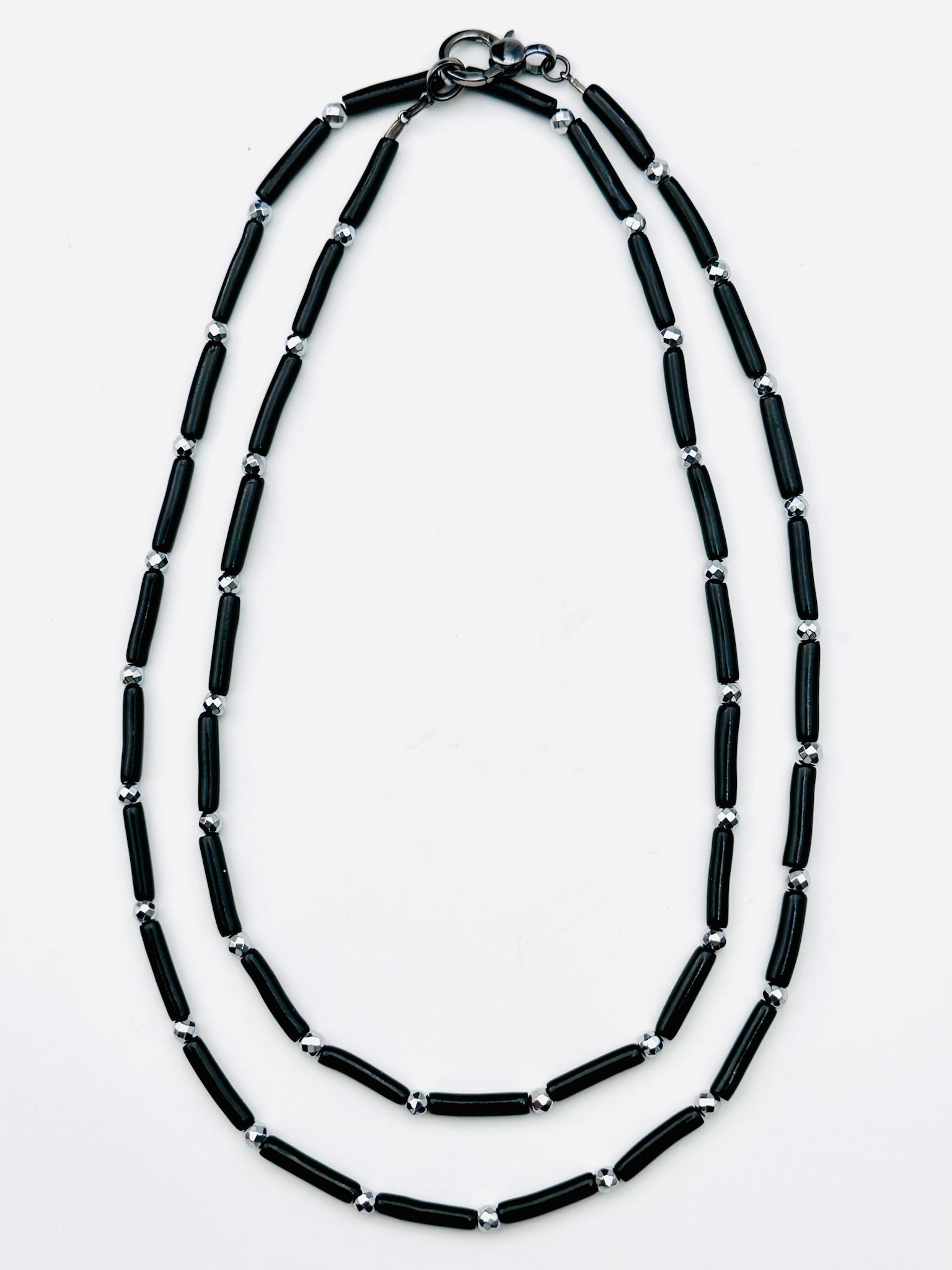 Tube Shaped Black Coral and Silver Pyrite Necklace with Sterling Silver Clasp, 36" length