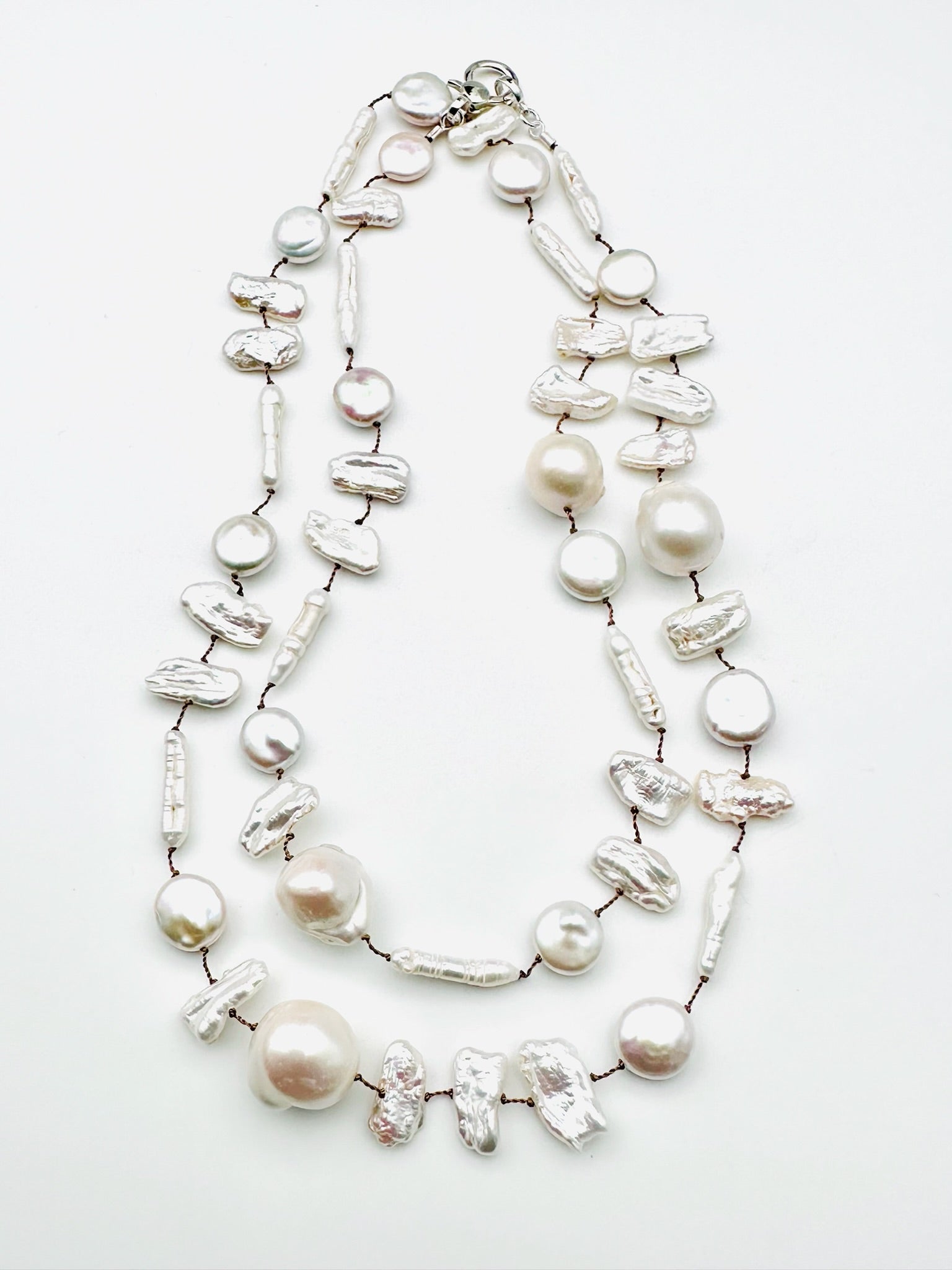 White Freshwater Keshi and Coin Pearl Mix Necklace with Sterling Silver Clasp, 36" length
