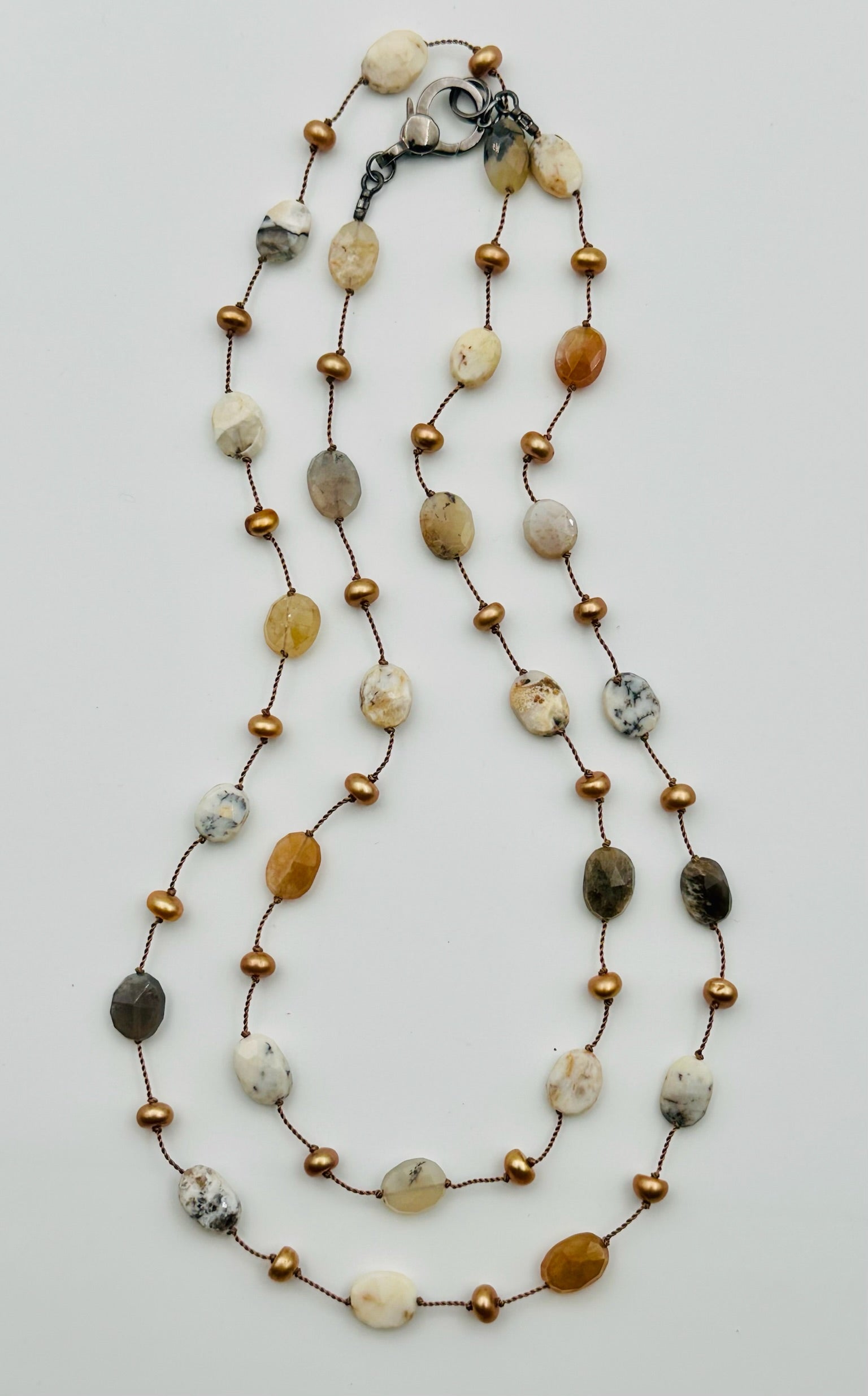 Neutral Colored Faceted Natural Opal and Tan Freshwater Pearl Necklace, 36" length, Sterling Silver