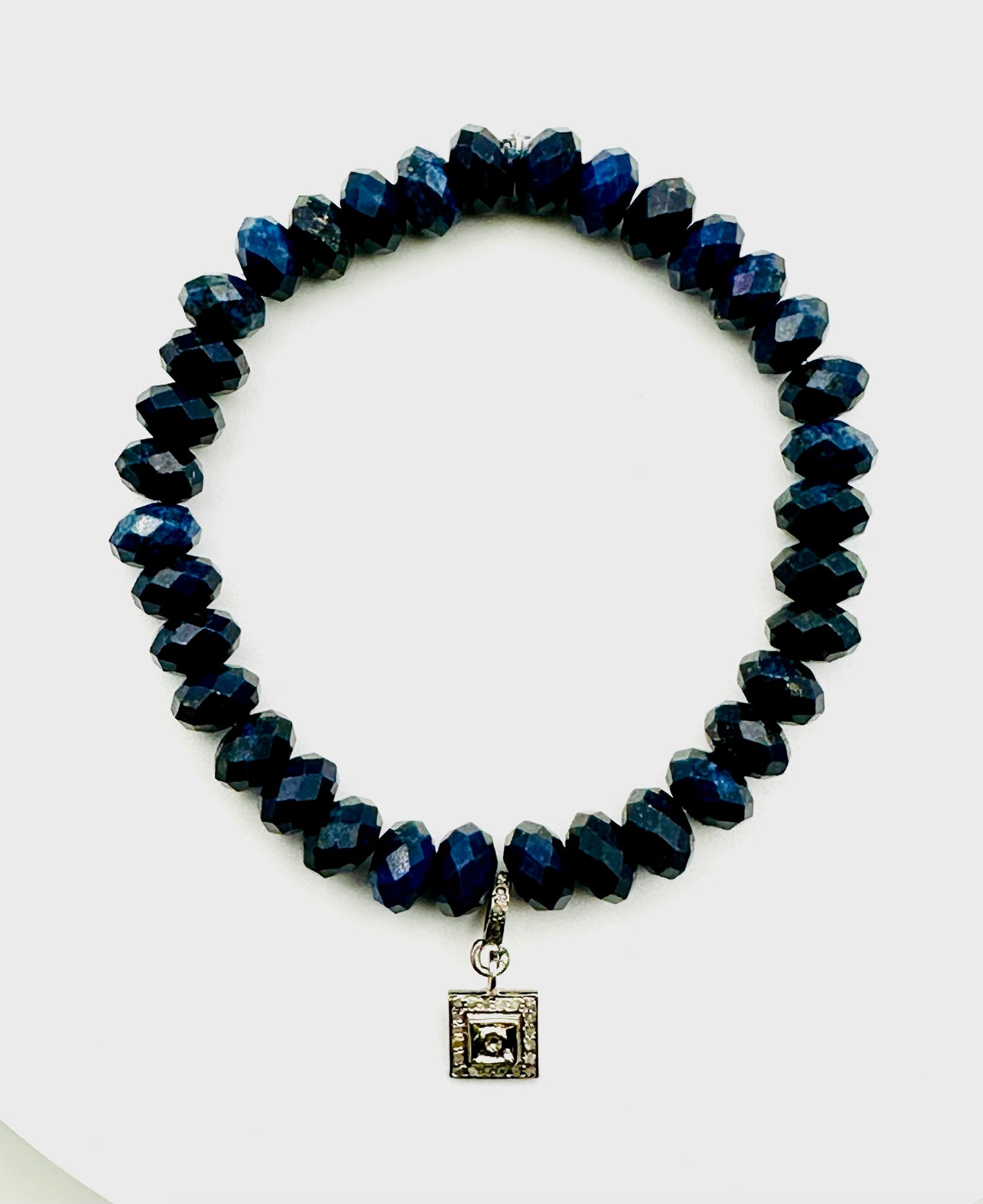8mm Faceted Lapis Rondelle with Sterling Silver Square Diamond Charm, 7.25"