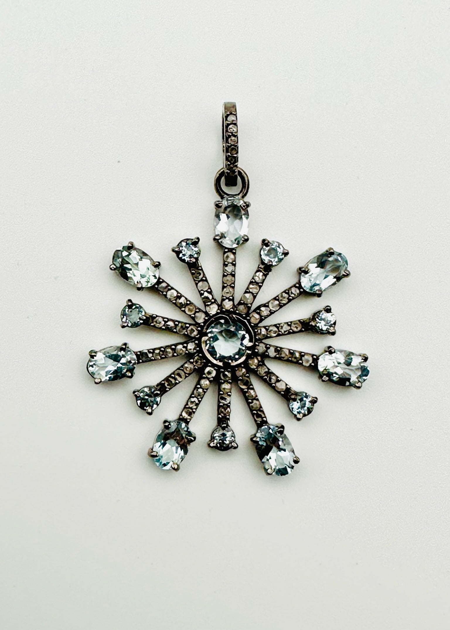 Aquamarine and Diamond Sunburst/ Pendant with Sterling Silver