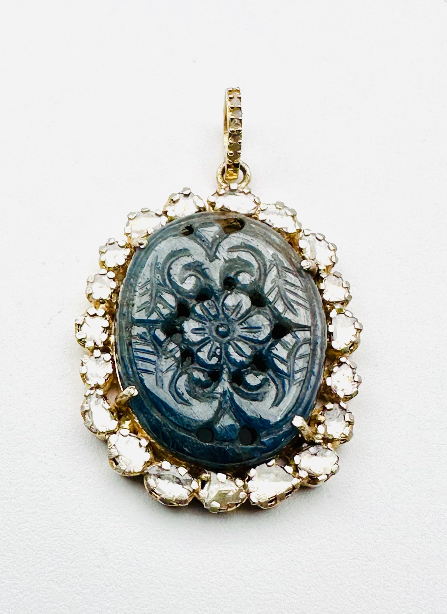 Carved Labradorite and 1.19 cts Diamond, 18K YG Vermeil Pendant, 1.75"