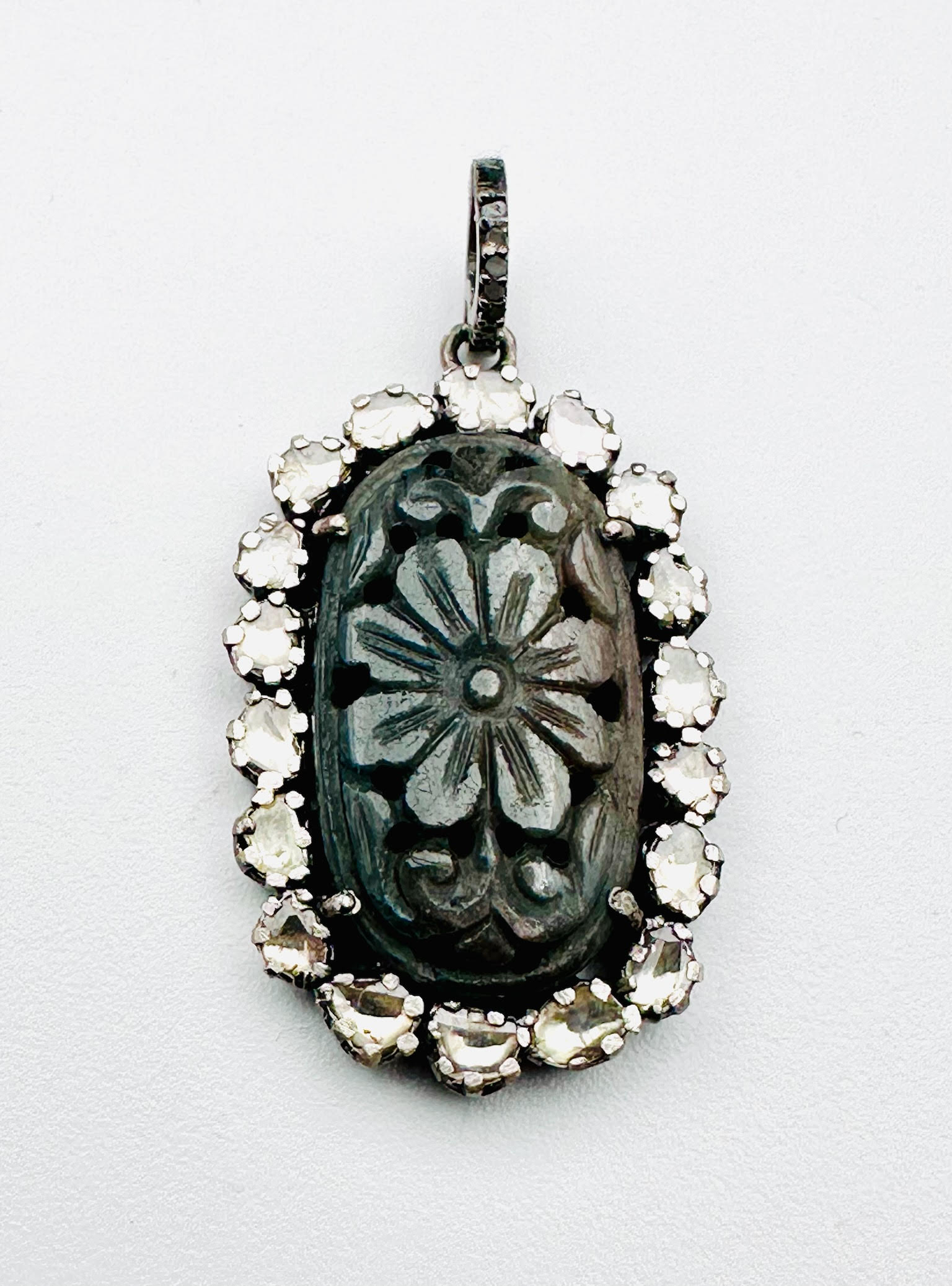 Carved Labradorite Oval Sterling Silver Pendant with AAA 1.07 cts Diamonds, 1.50"