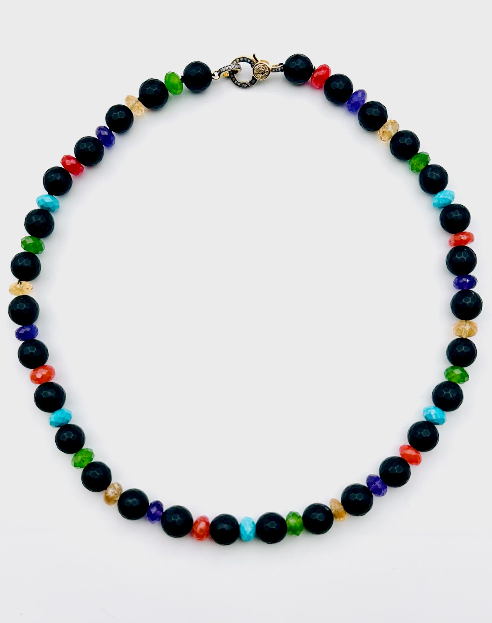 Faceted Black Onyx Ball and Faceted Multi Gemstone Rondelle Necklace with Vermeil and Sterling Silver Diamond Clasp, 18"