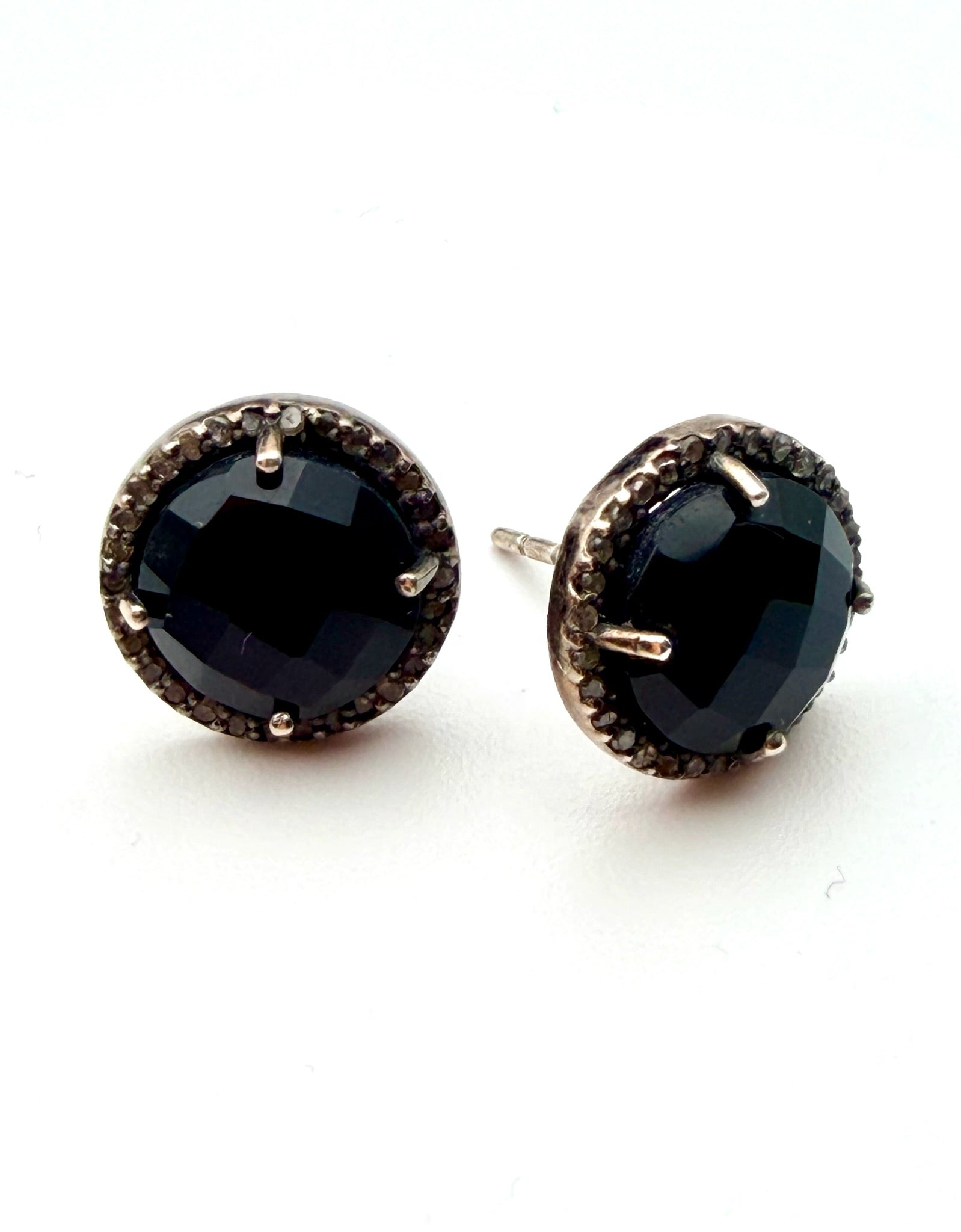 Faceted Black Spinel and Diamond Sterling Silver Stud Earring, 0.5"