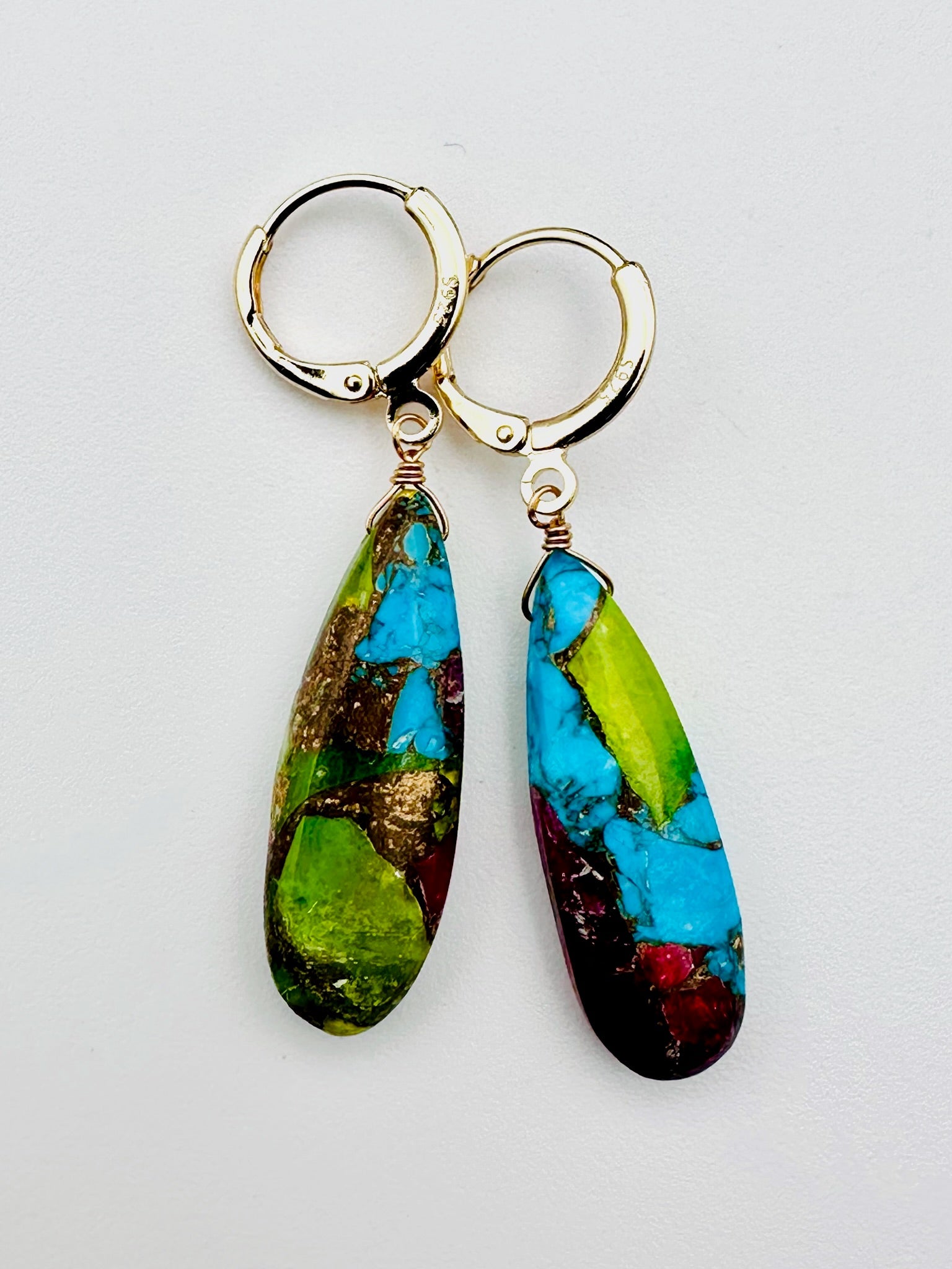 Faceted Copper Multicolor Turquoise Teardrop Earrings on Gold Fill Huggies, 2"