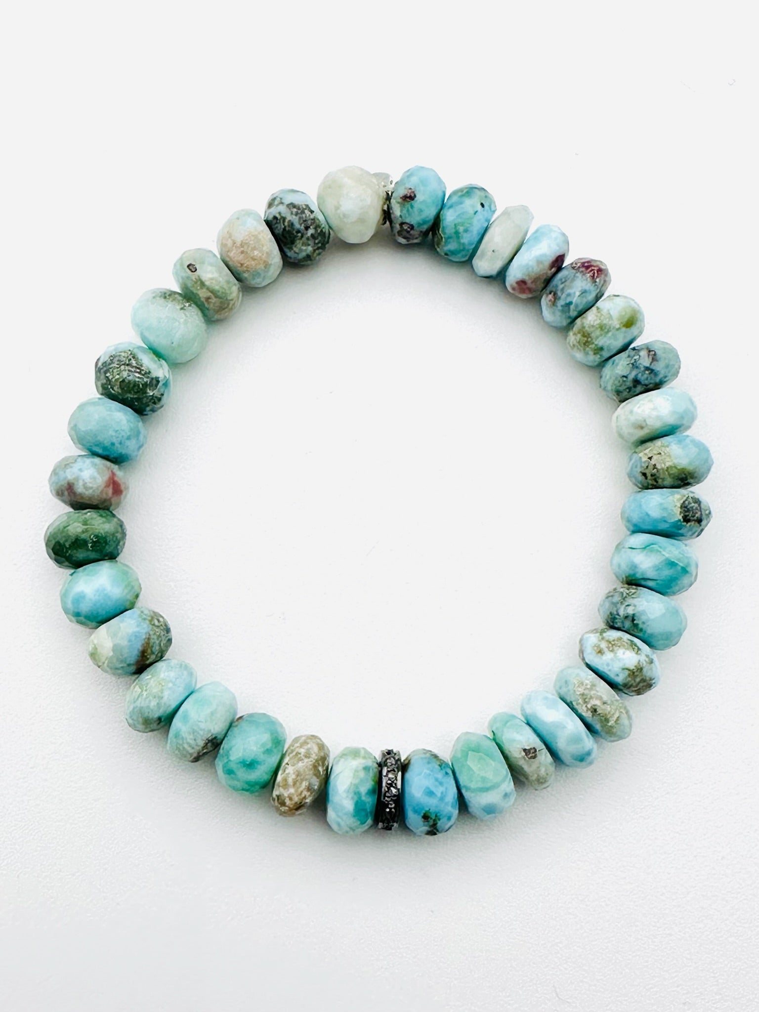 Faceted Larimar and Diamond Sterling Silver Rondelle Bracelet