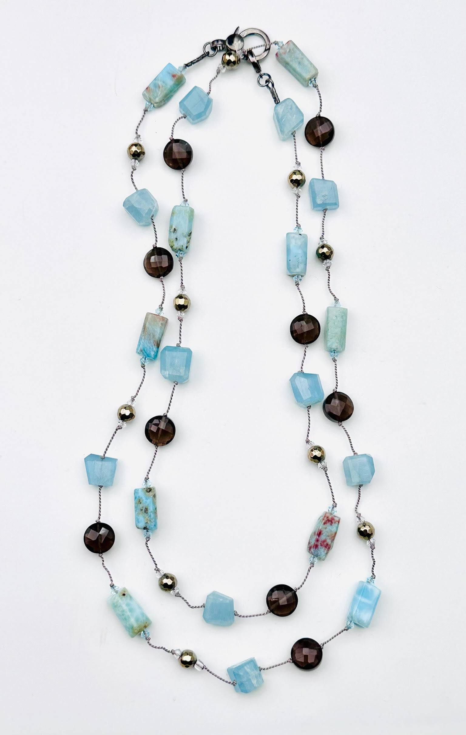 Faceted Natural Larrimar, Aquamarine, and Smokey Quartz Necklace with Sterling Silver Clasp, 36"