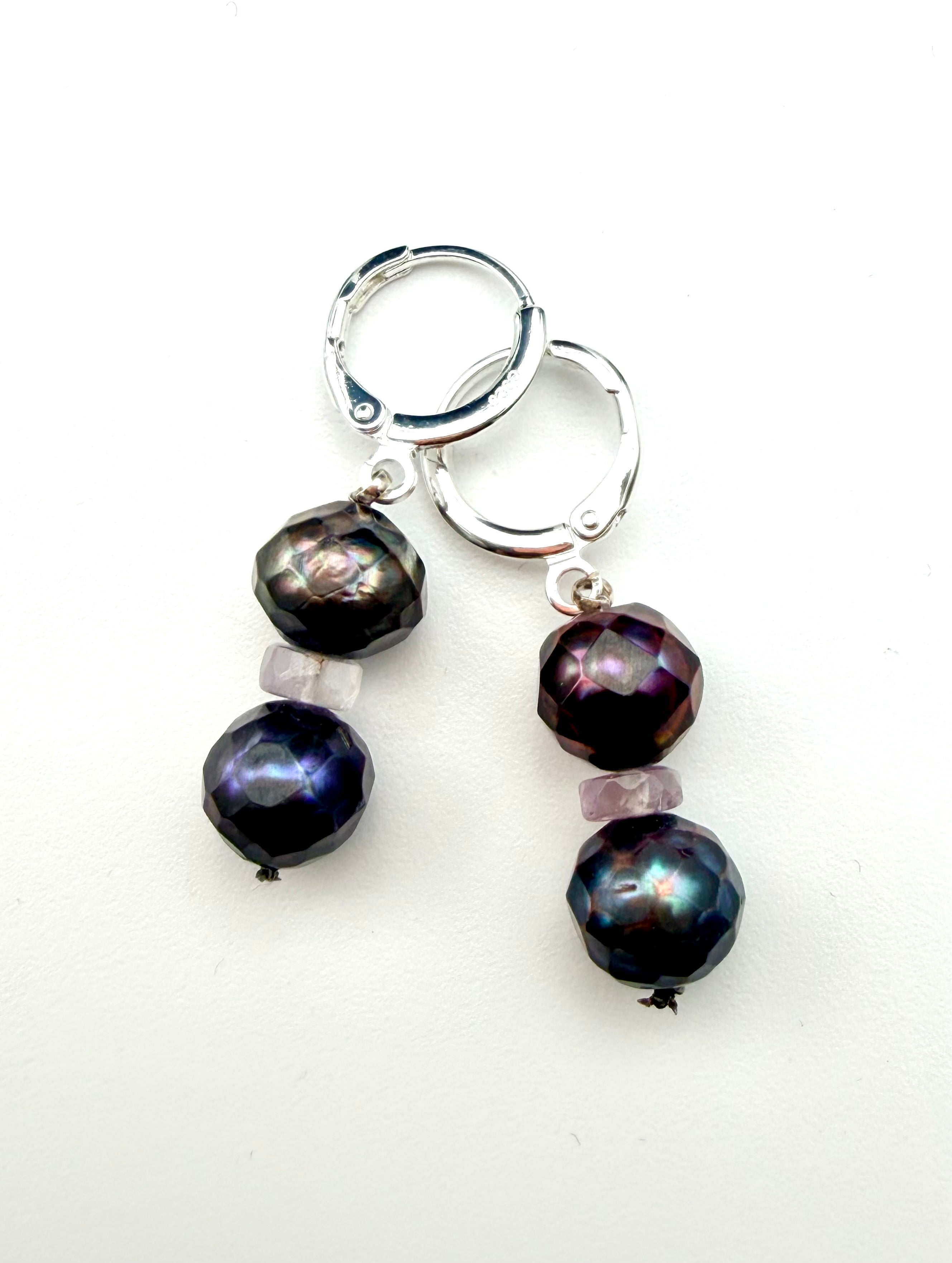 Faceted Peacock Freshwater Pearl and Amethyst Heishi Earring on Sterling Silver Huggie, 1.5"