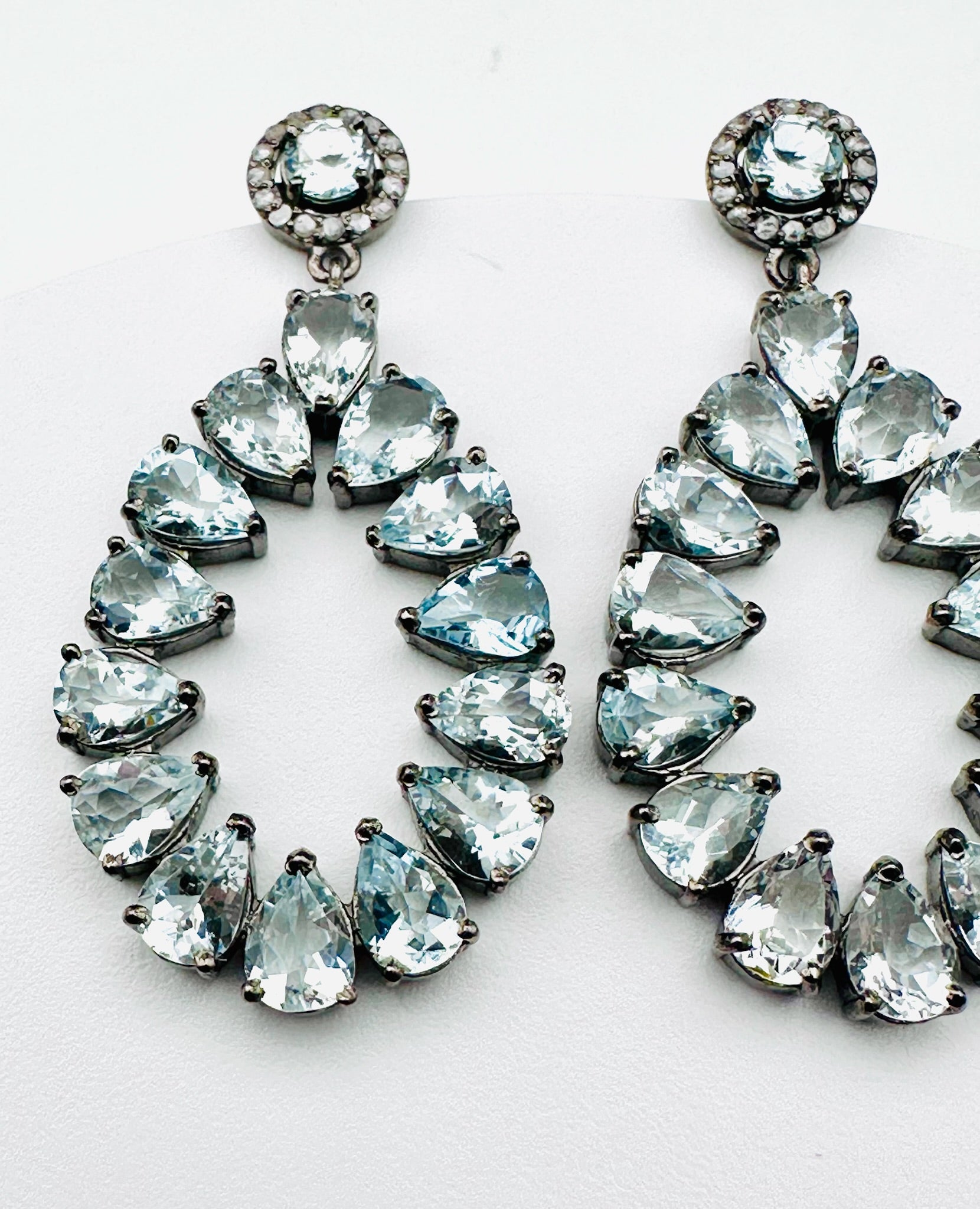 Faceted Pear Shaped Aquamarine and Diamond Sterling Silver Post Earrings, 2.25"