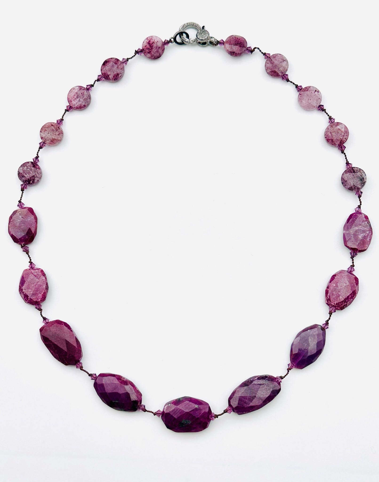 Faceted Raw Ruby and Strawberry Quartz Necklace with Sterling Silver Diamond Clasp, 18"
