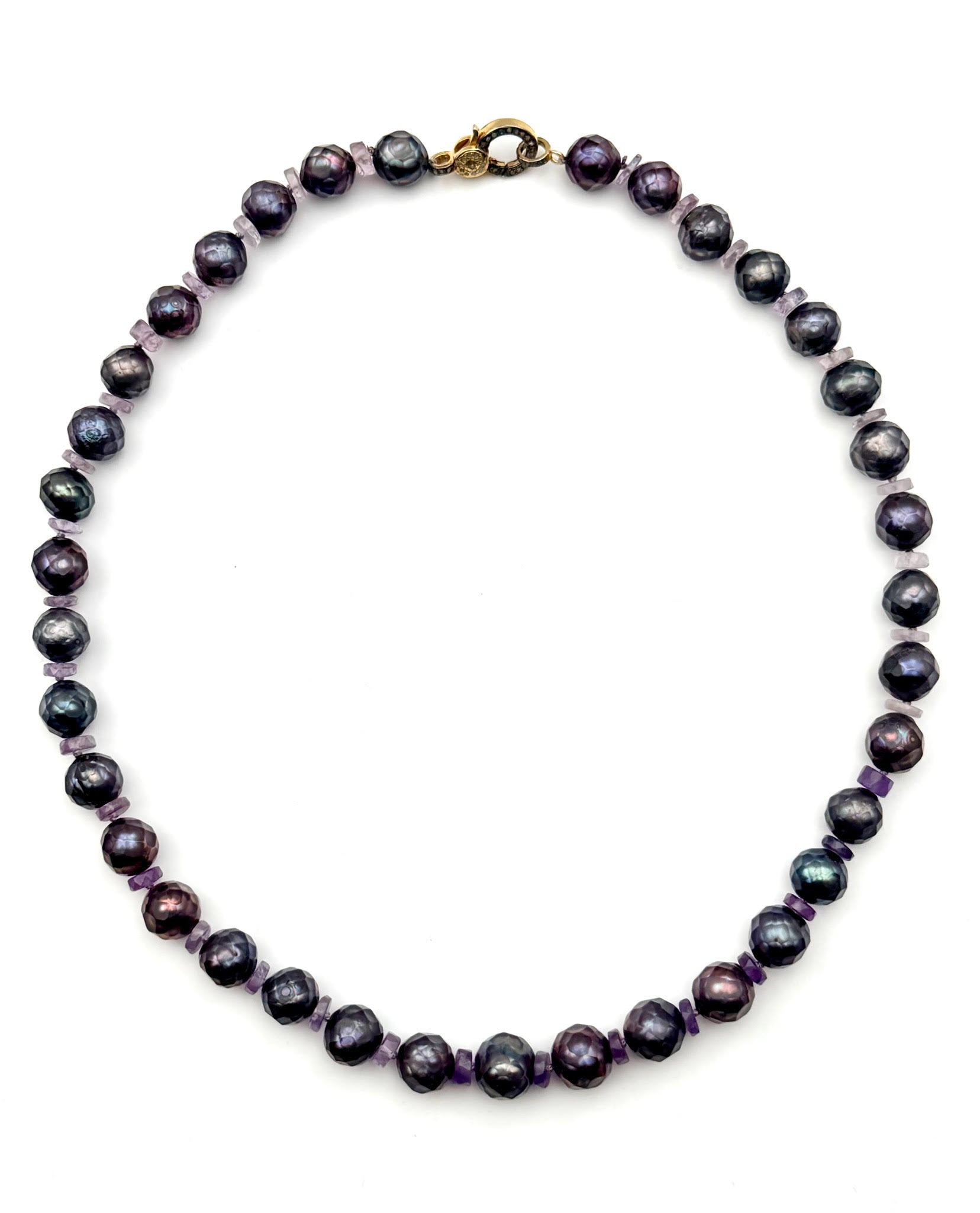 Faceted Shimmery Iridescent Peacock Freshwater Round Pearl and Ombre Amethyst Heishi Necklace with Vermeil and Diamond Clasp, 18"