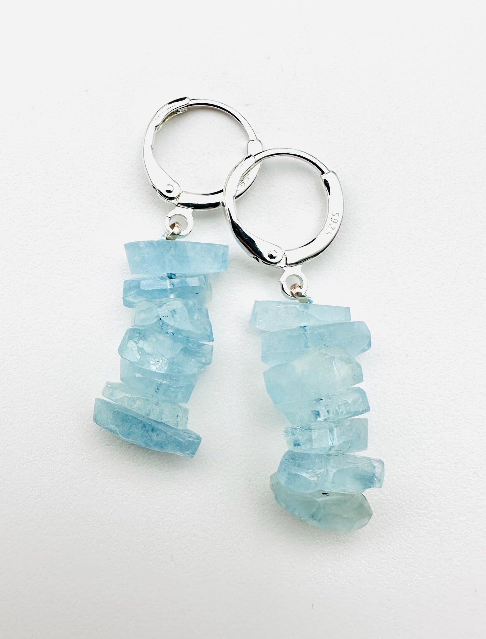 German Cut Organic Aquamarine Slices on Sterling Silver Huggie. 1.75"