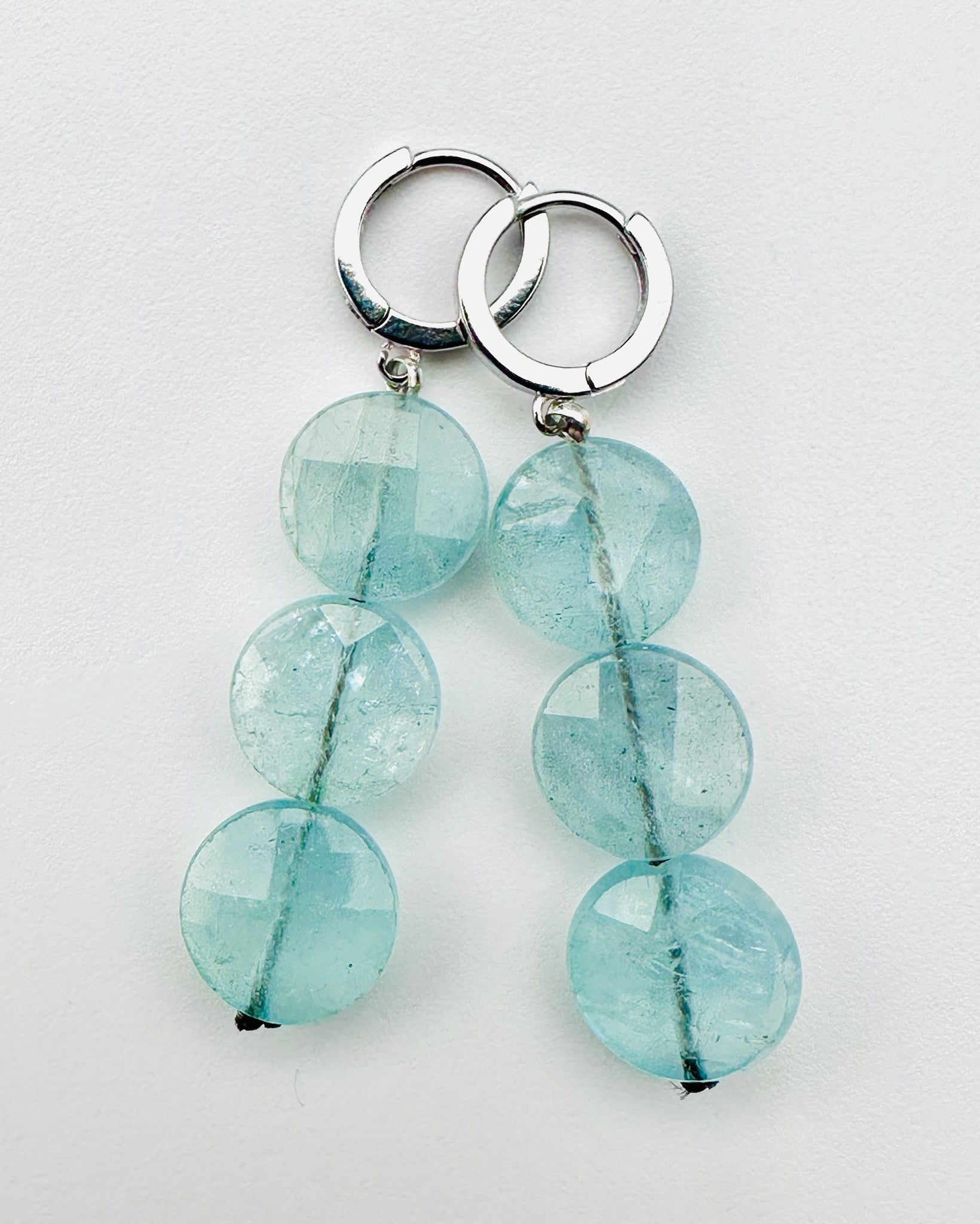 Hand-Cut Faceted Coin Shaped Triple Aquamarine Earring on Vermeil Text, 2"
