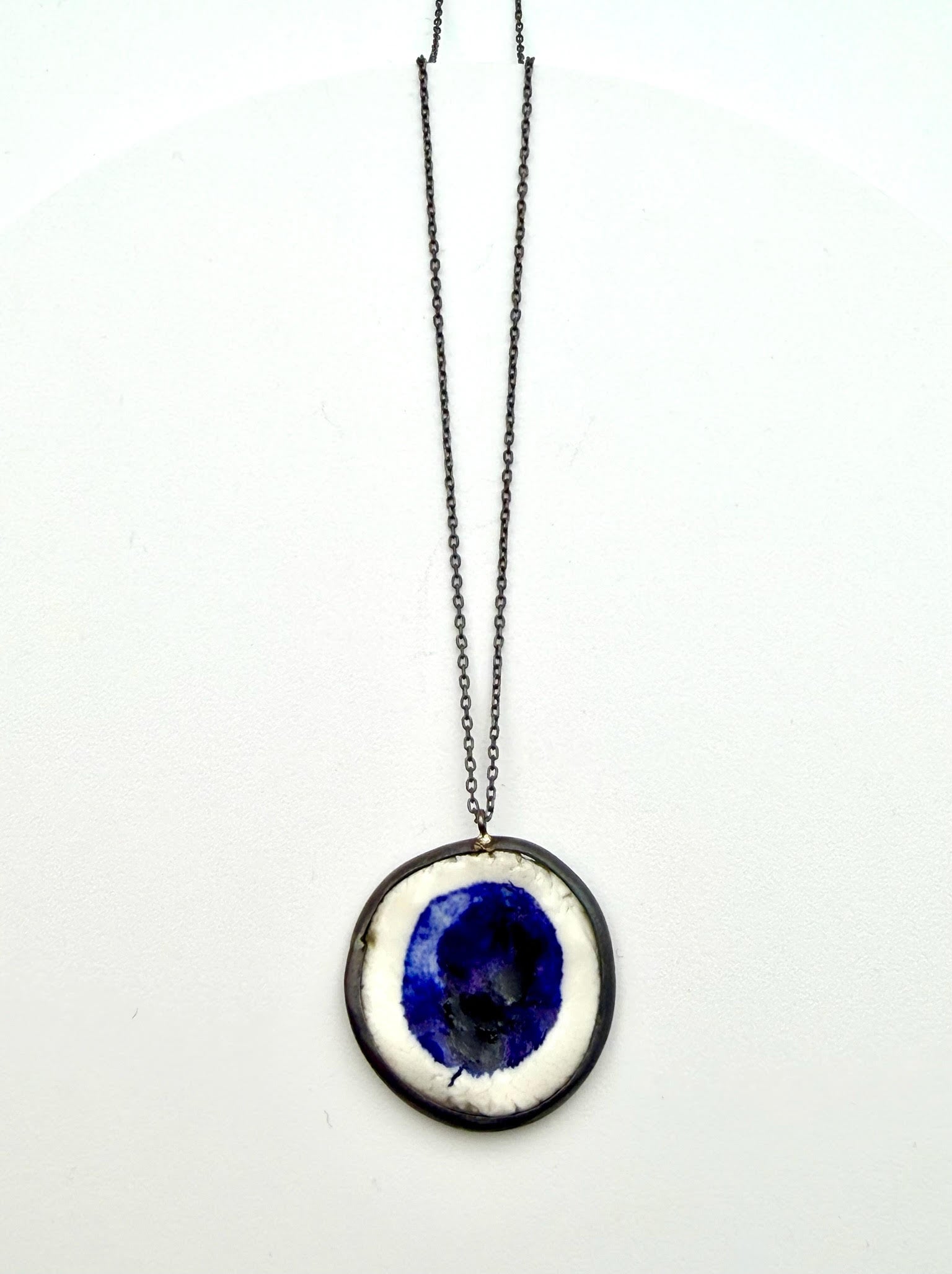 Handmade Turkish Porcelain Eye with a Rhodium Plated Bezel and Chain, 17"