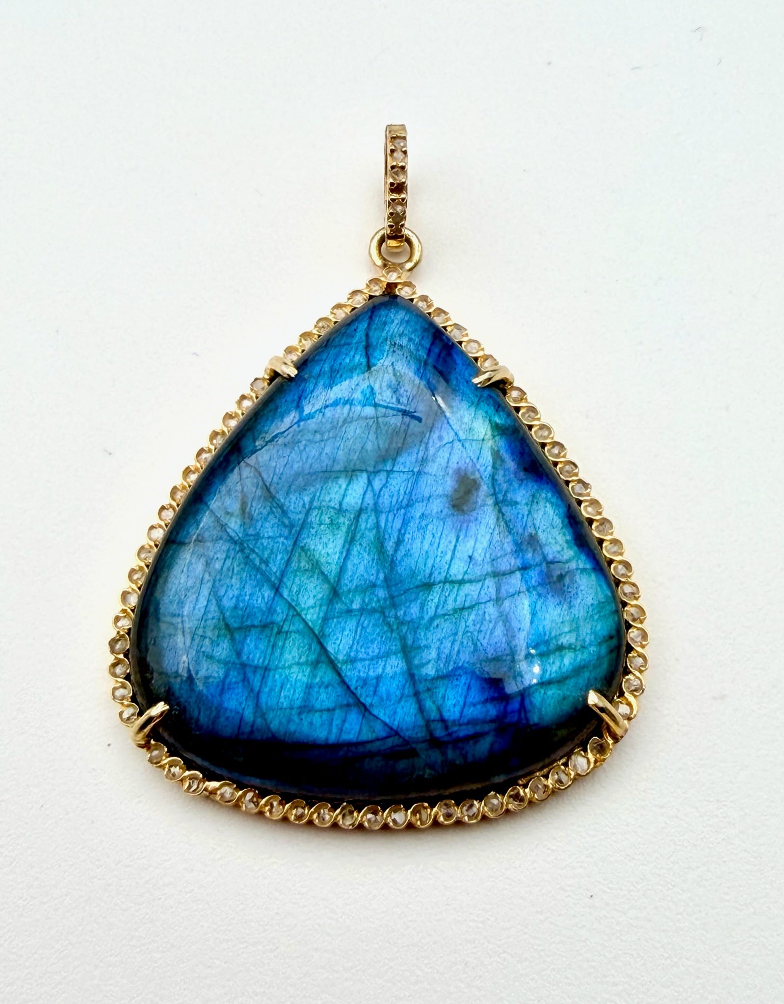 Labradorite Teardrop Shaped Cabochon Vermeil Diamond Pendant, 2.25" H