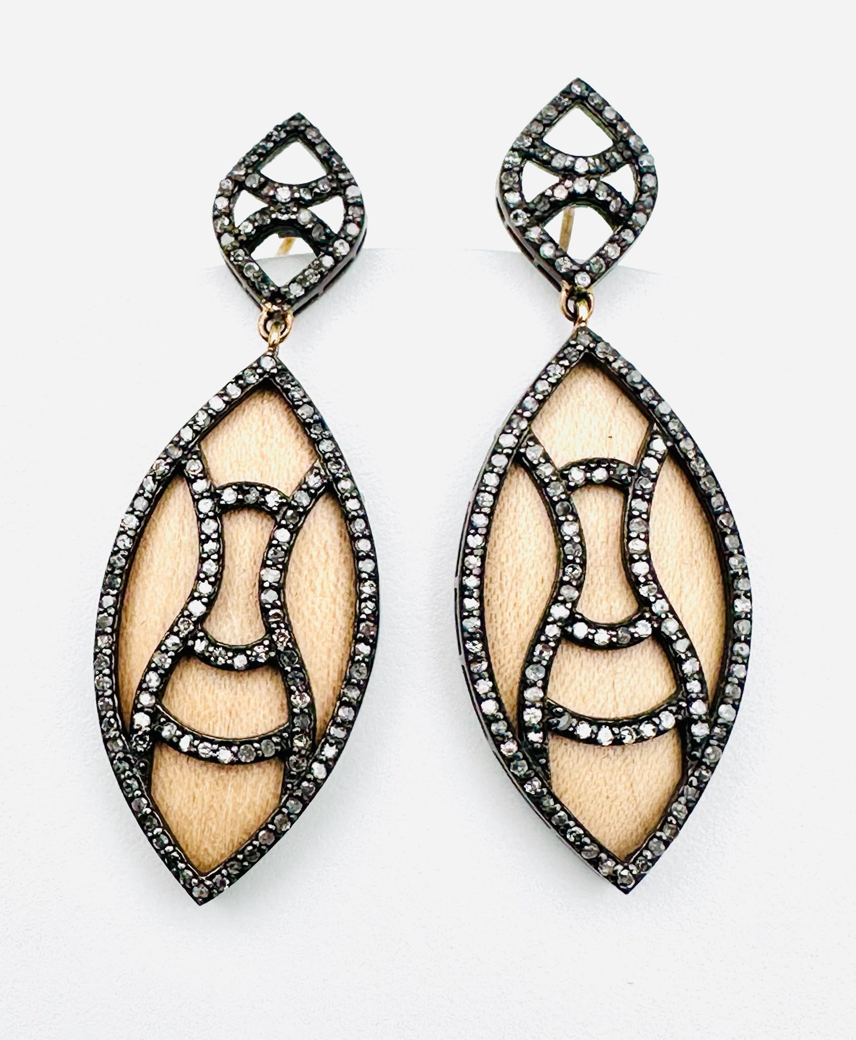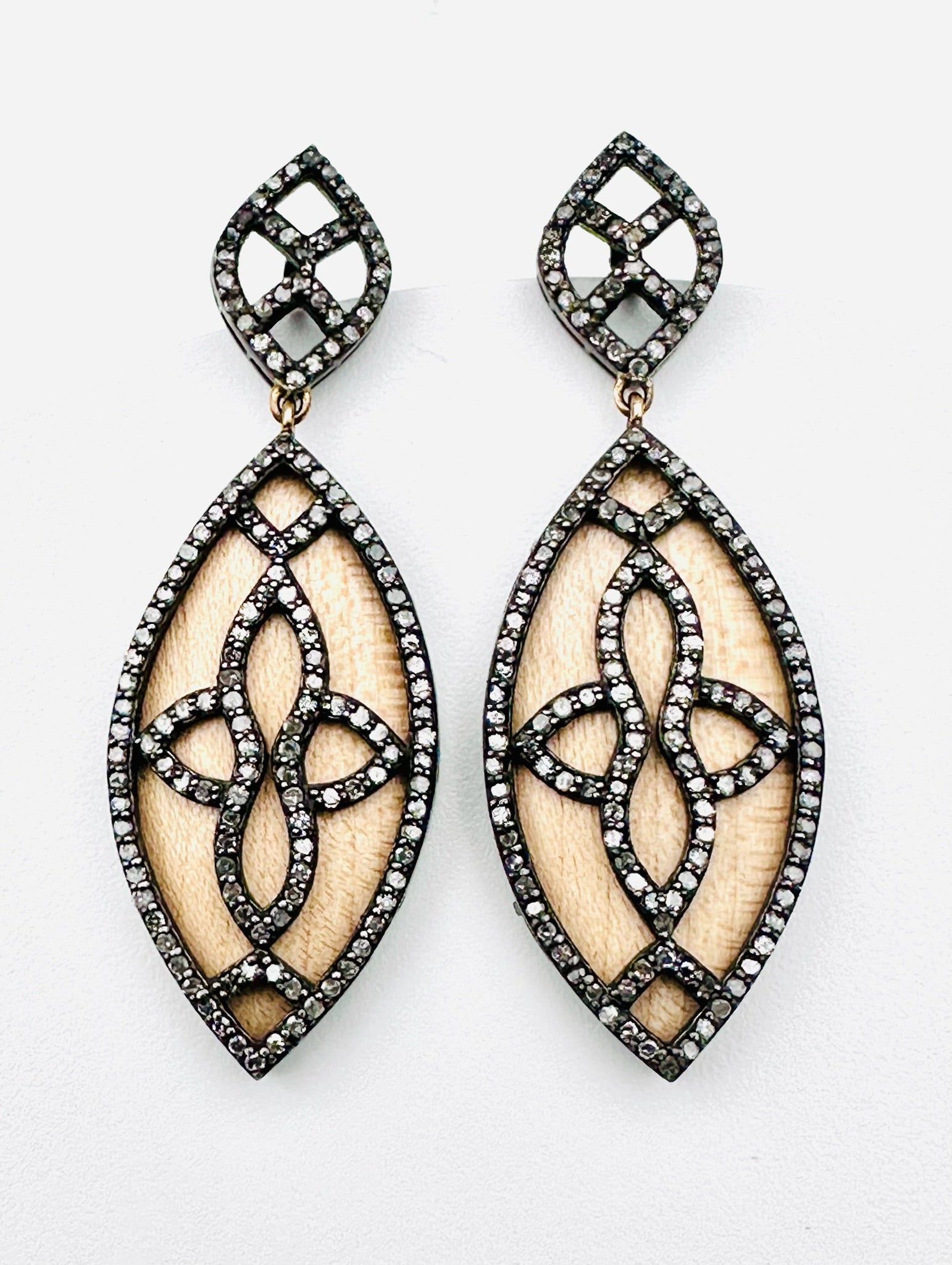 Light Wood Sterling Silver and Diamond Marquise Shaped 14K Yg Post Earring, 2.25"