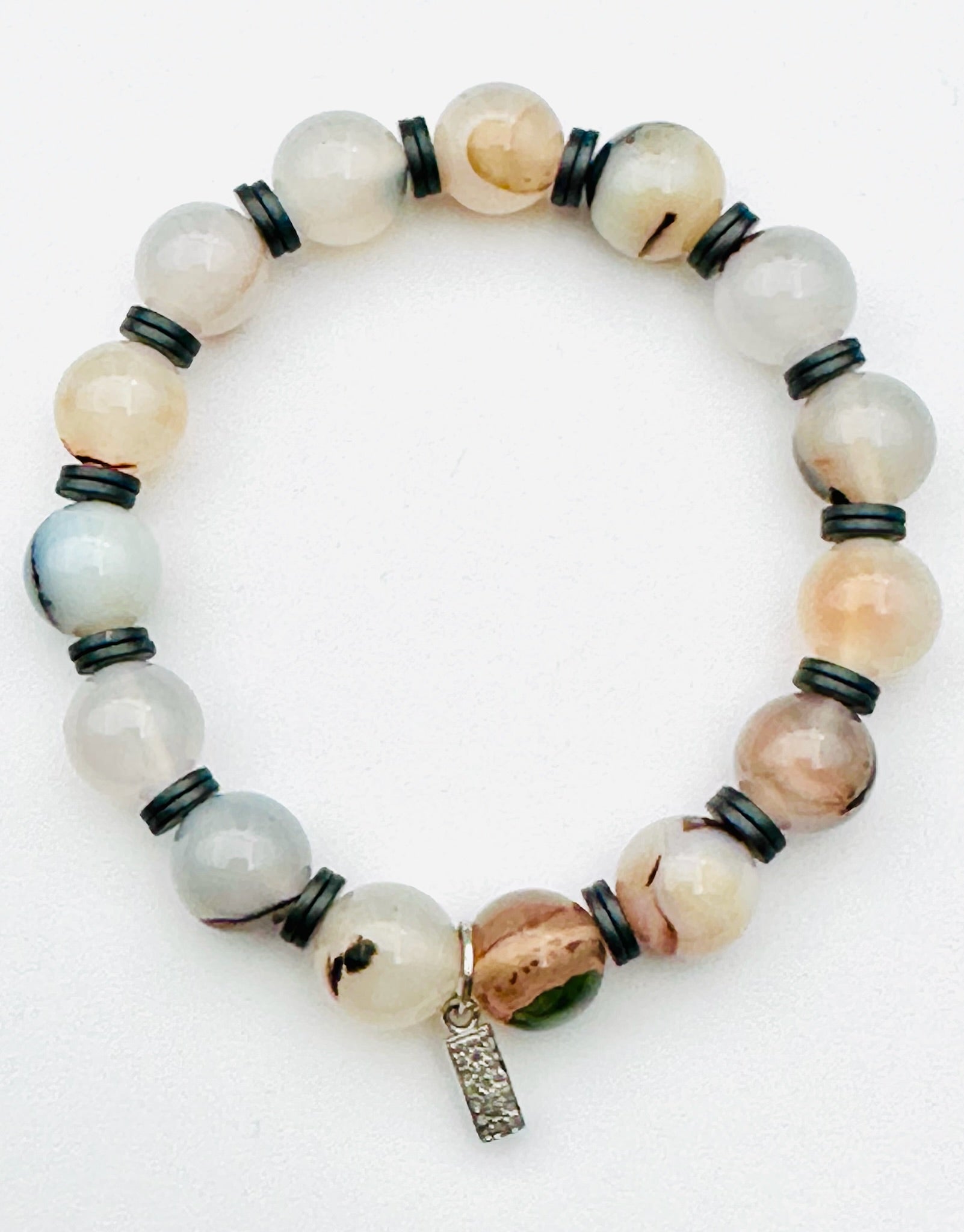 Montana Agate Ball Stretch Bracelet with Sterling Silver Diamond Rondelle, 7.25"