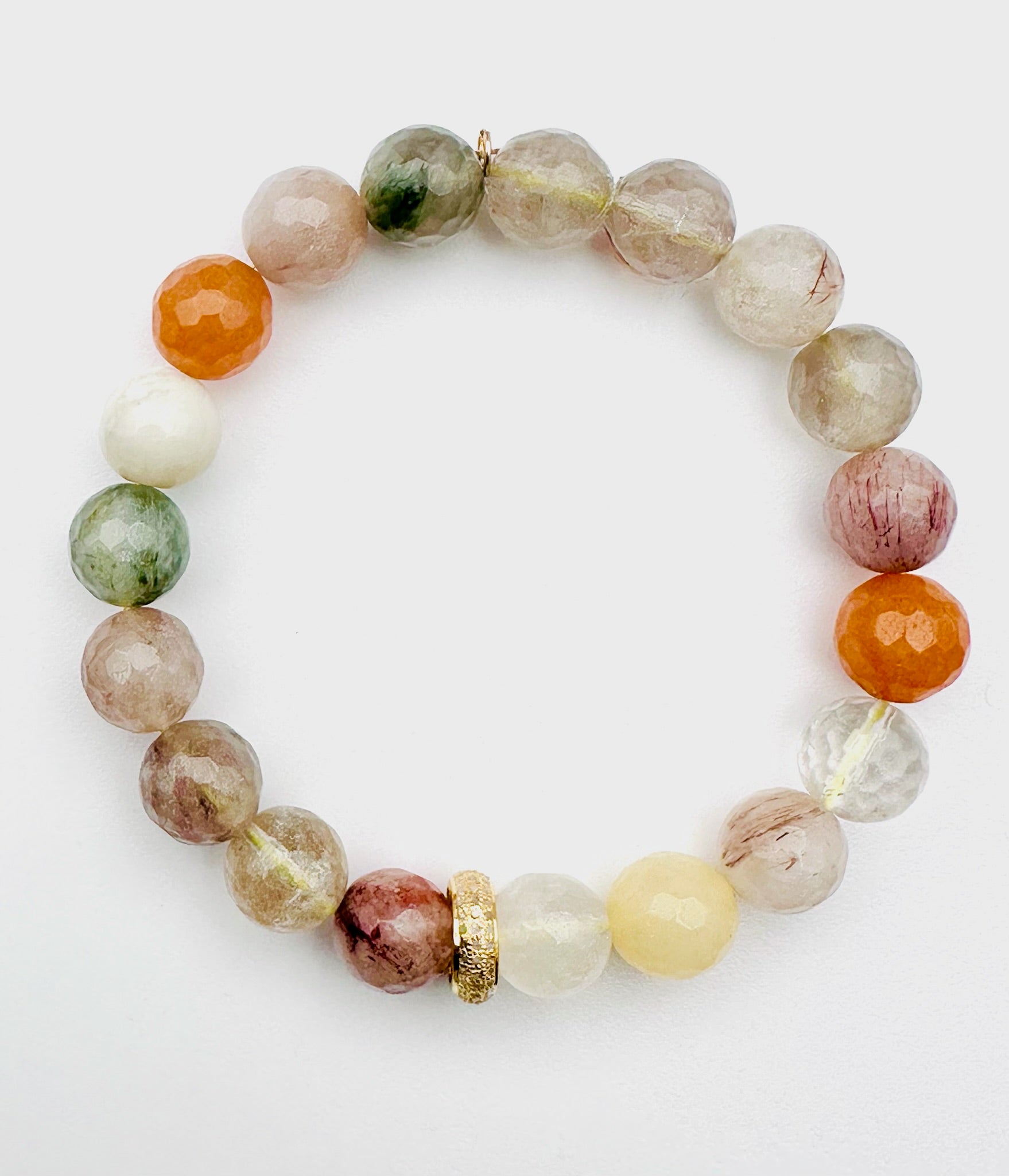 Multi Color Faceted Rutilated Quartz Ball Bracelet with Three Row Vermeil Diamond Rondelle