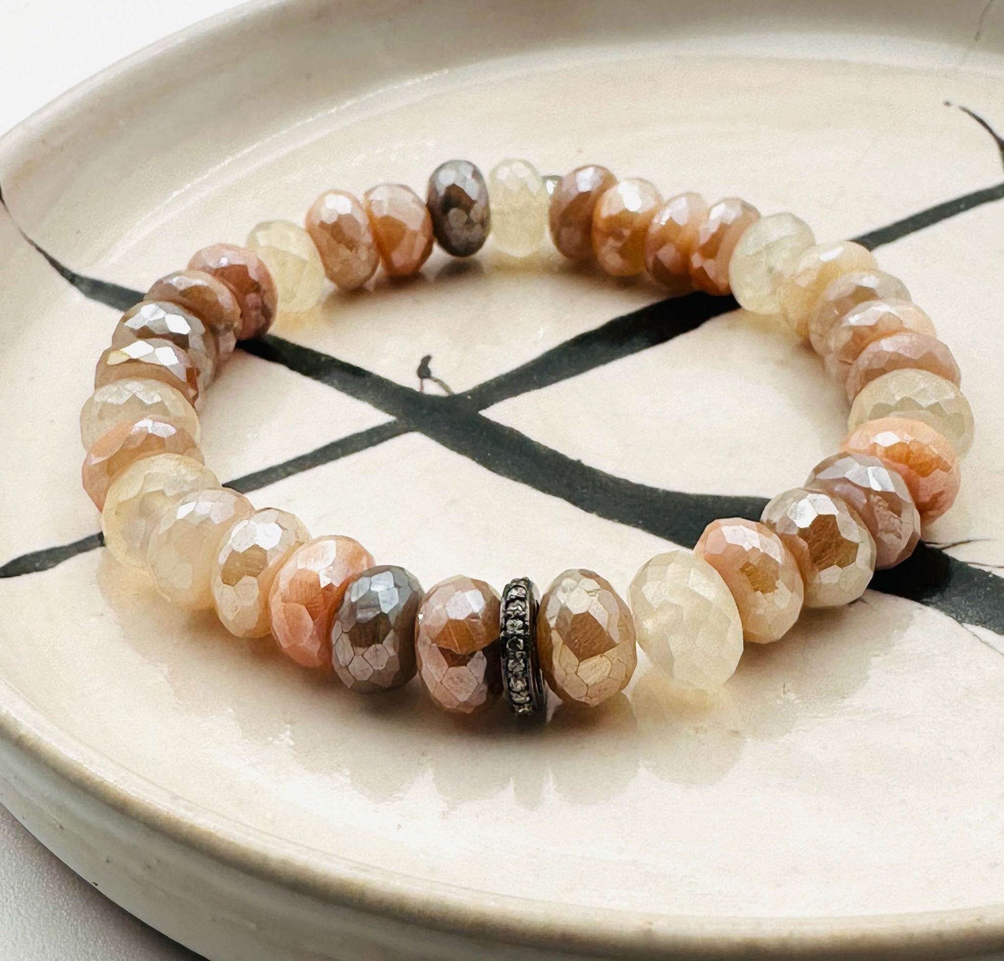 Multi-Color Mystic Moonstone with Sterling Silver and Diamond Rondelles Stretch Bracelet