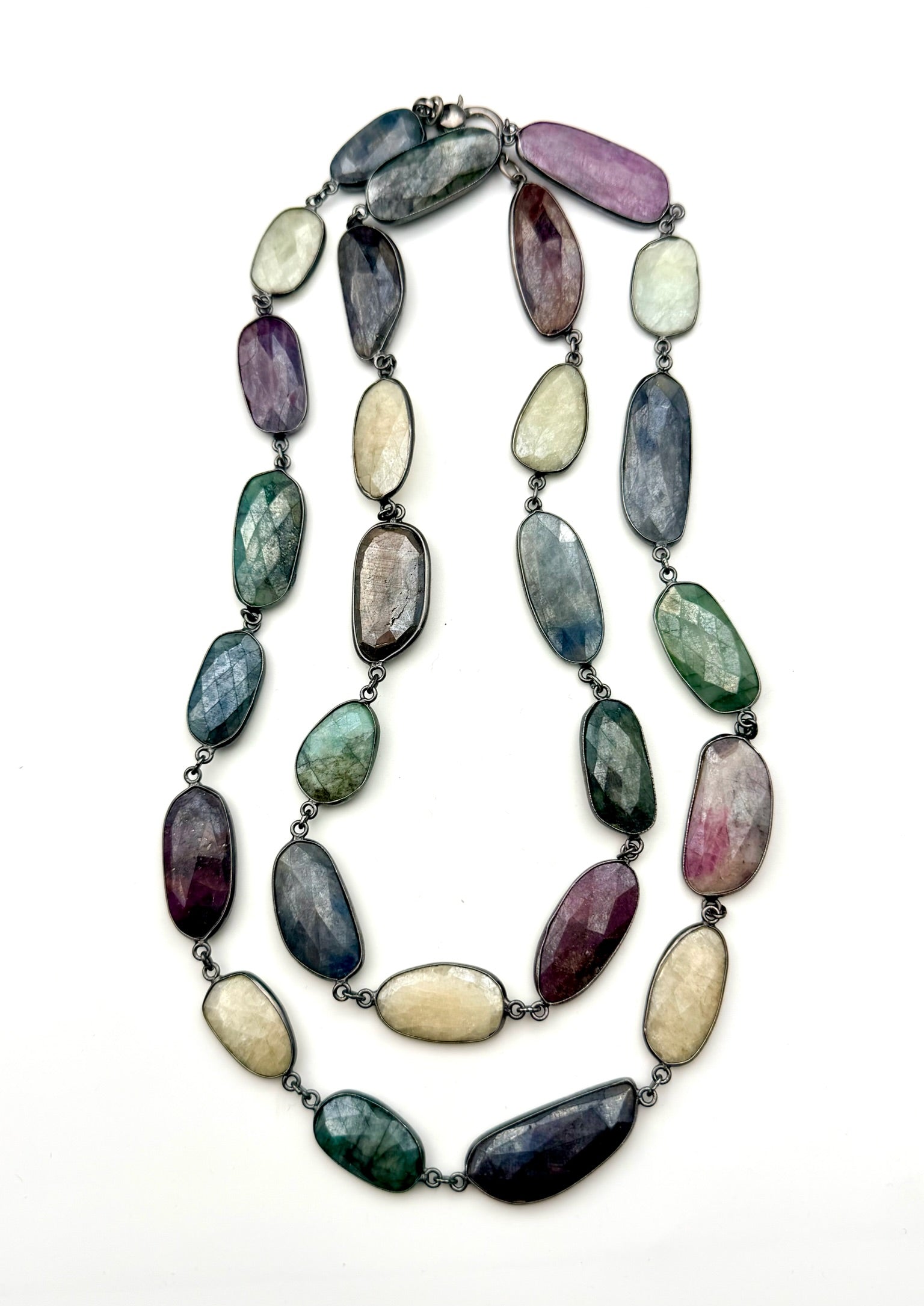 Multicolor Faceted Sapphire with Rhodium Sterling Silver Bezel and Clasp, 36"
