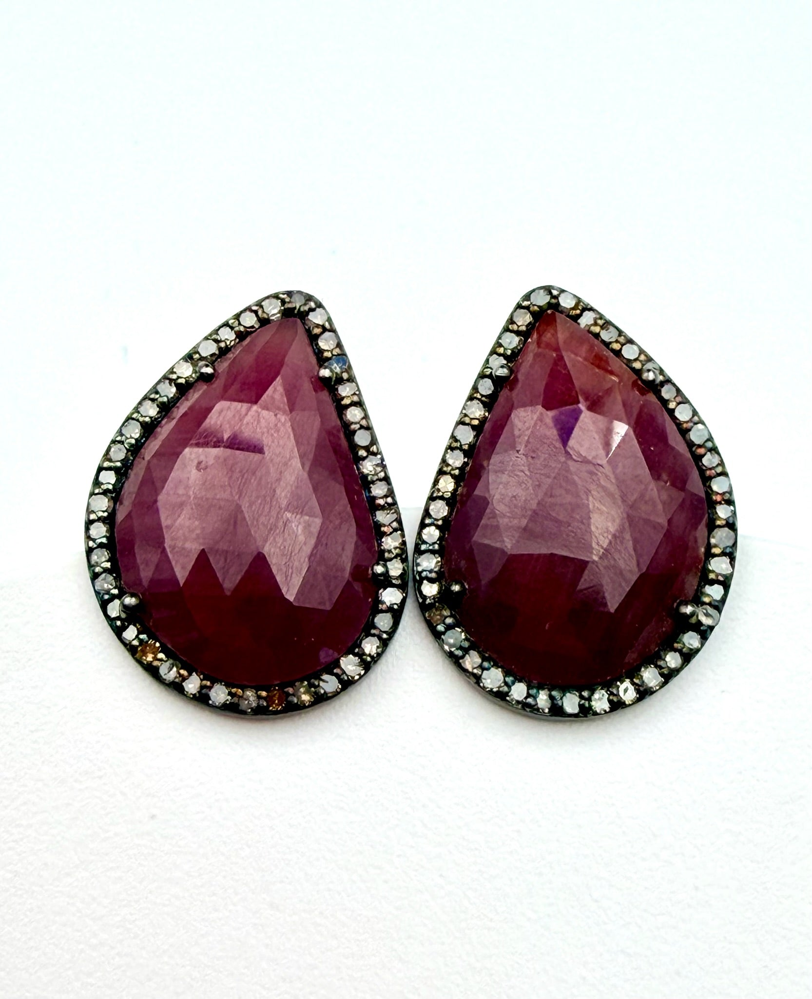 Organic Ruby and Diamond Teardrop Shaped Sterling Silver and Diamond, 0.8"