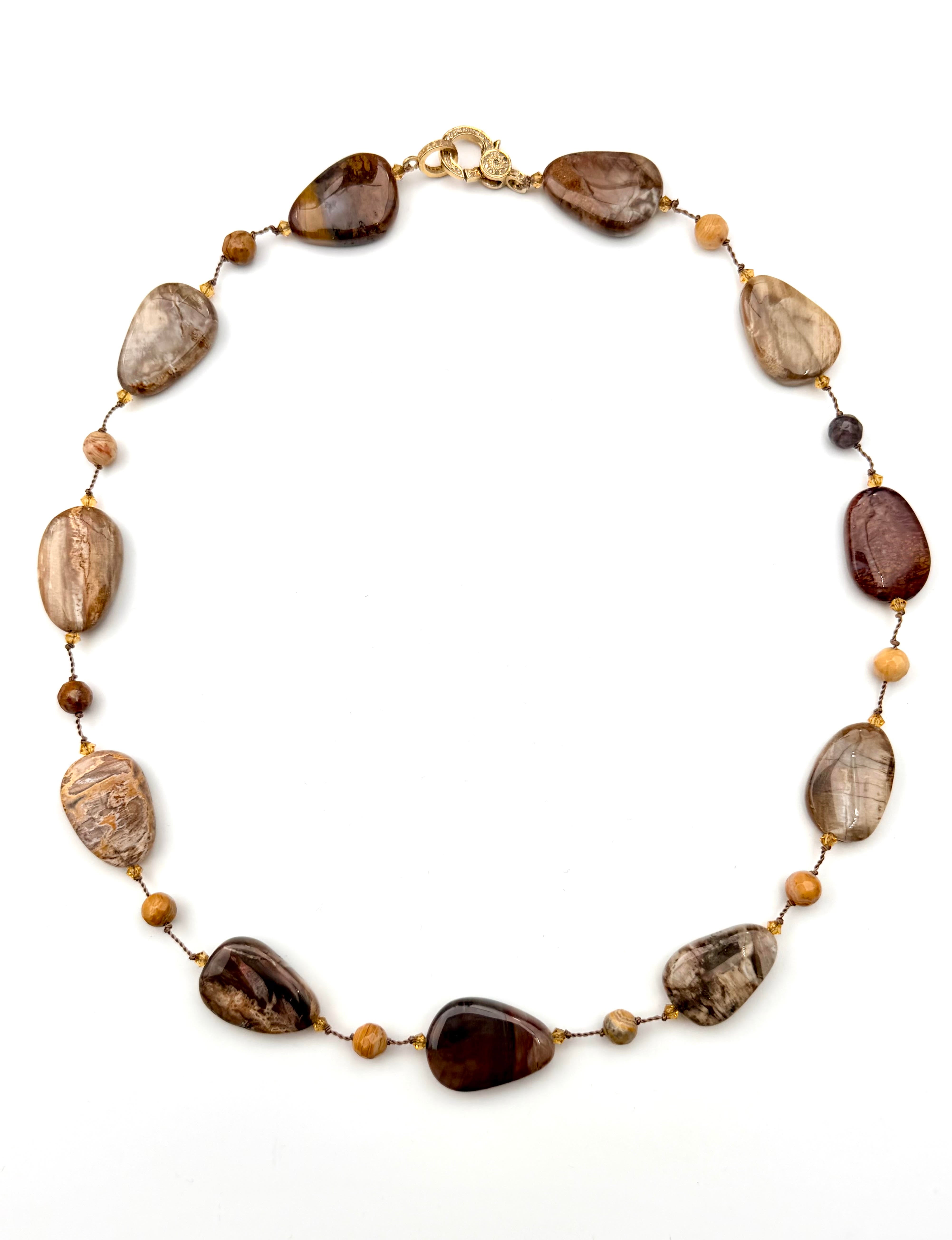 Petrified Wood and Crazy Lace Jasper Necklace with 18K YG Vermeil and Diamond Clasp, 20"