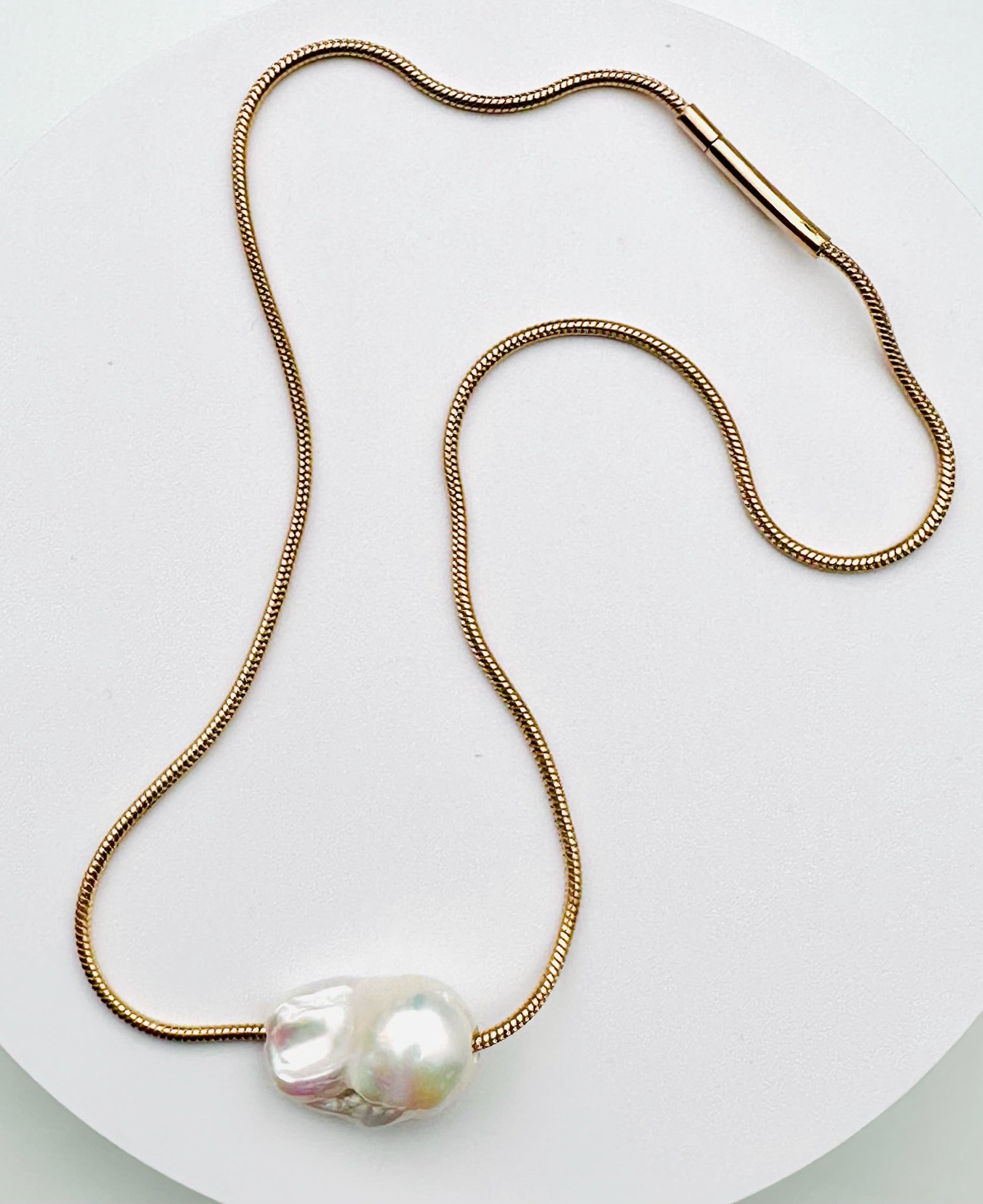 Removable White Baroque Freshwater Pearl Gold Plated Stainless Steel Snake Chain Necklace, 16"