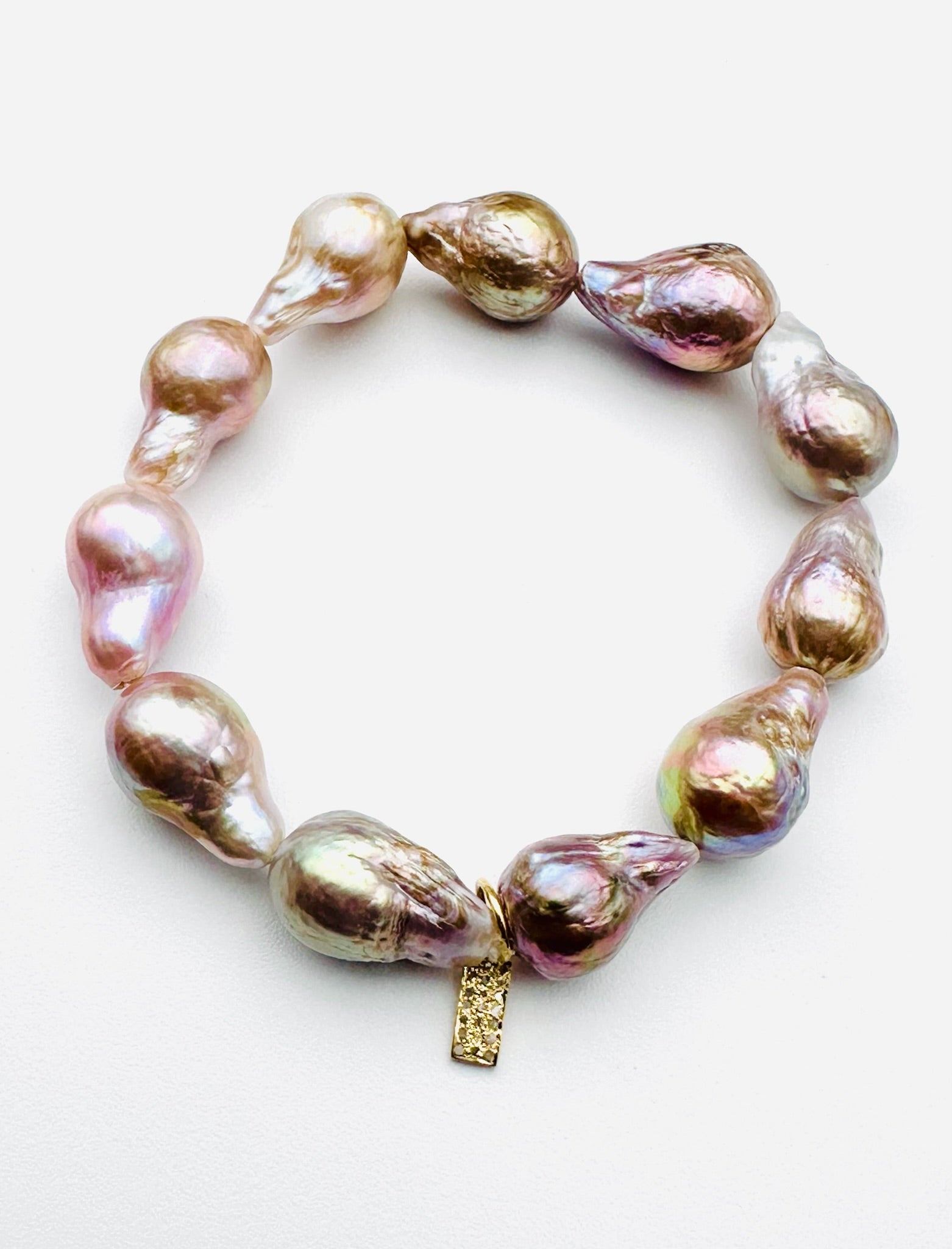 Small Natural Freshwater, Baroque Stretch Bracelet with Petite Vermeil (18k/sterling silver) and Diamond Dog Tag, 7.25"