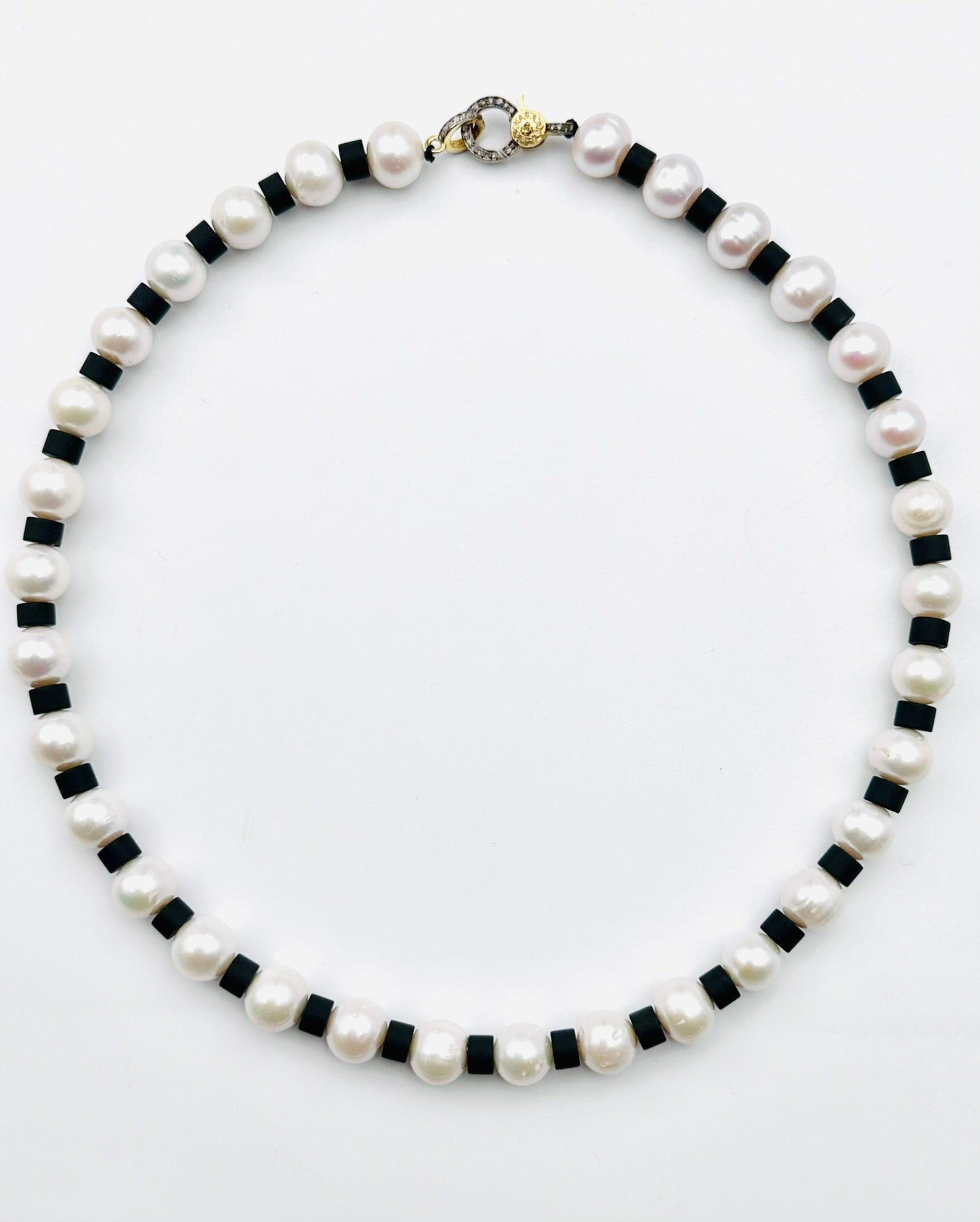 White Edison Freshwater Pearl and Matte Black Onyx Necklace with Vermeil and Sterling Silver Diamond Clasp, 18"