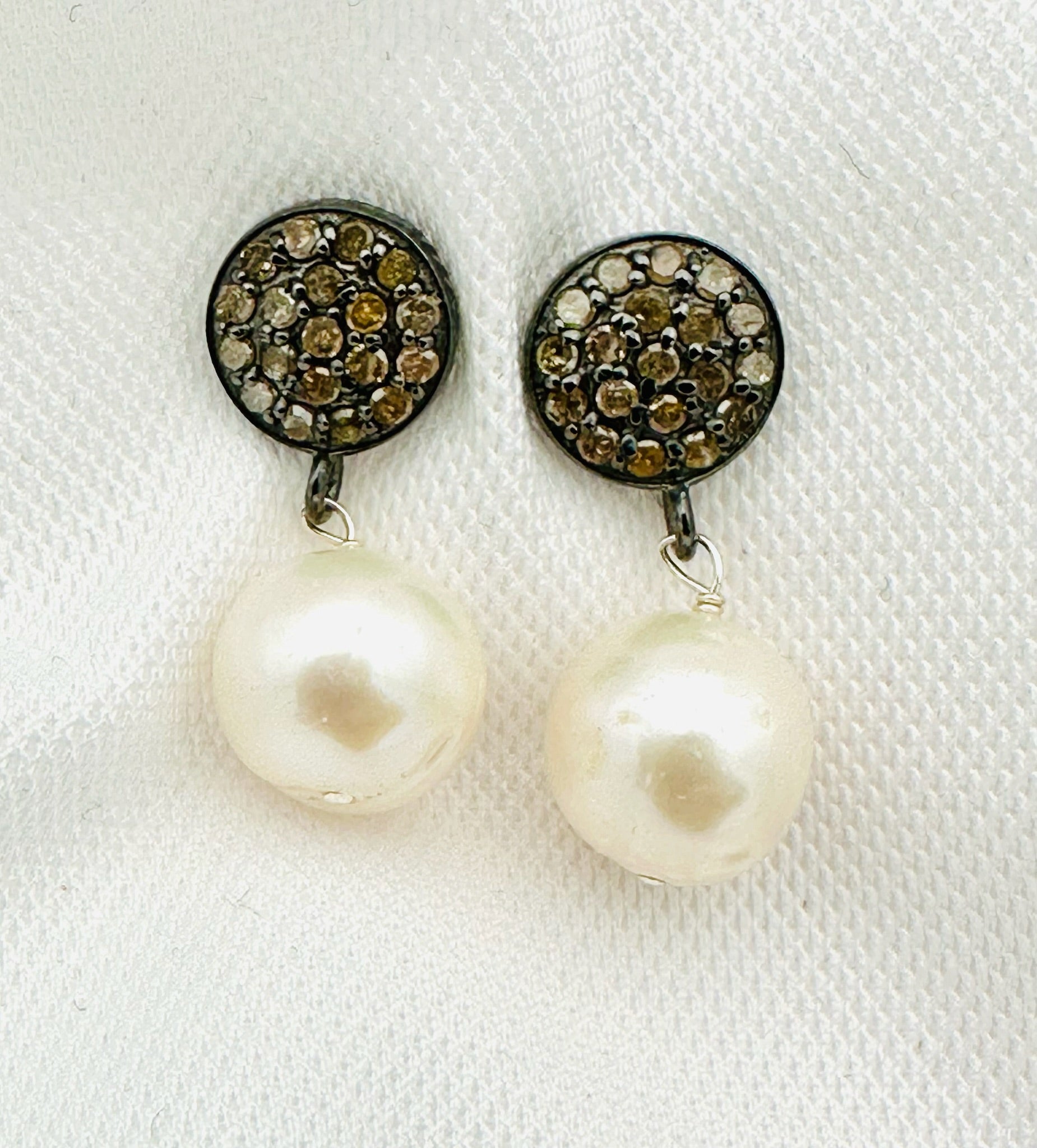 White Edison Freshwater Pearl with Rhodium Sterling Silver Diamond Post Earring Top 1.75"