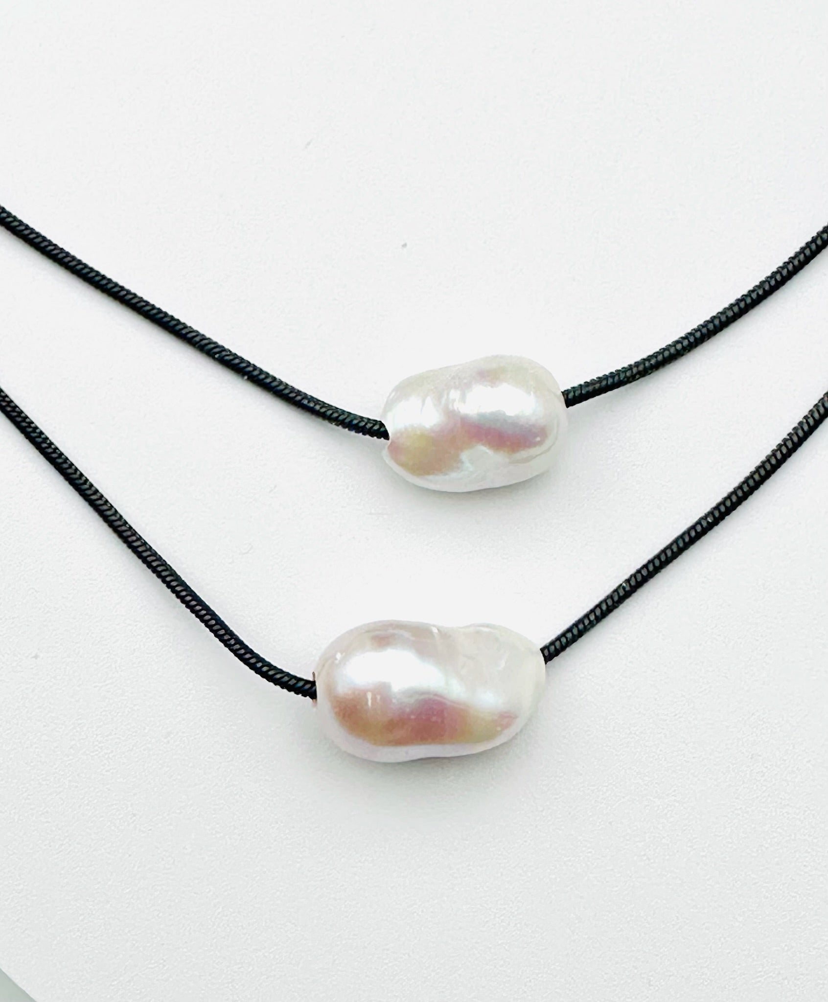 White Freshwater Baroque Pearl on Blk Rhodium Stainless Steel Snake Chain, 18"