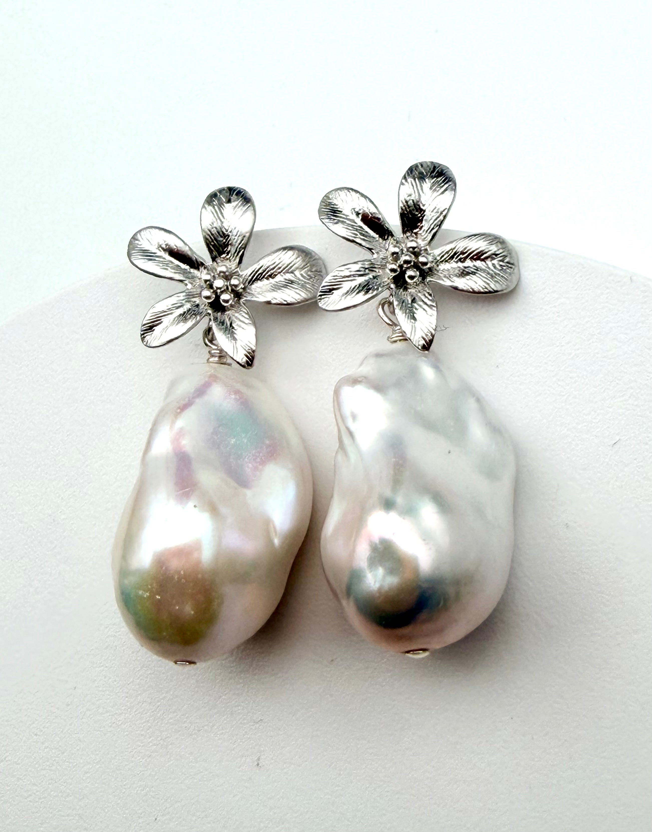 White Freshwater Baroque Pearl on Sterling Silver Orchid Shaped Post, 1.75"