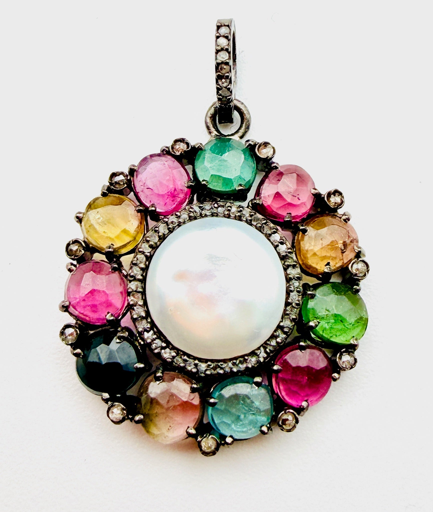 White Freshwater Coin Pearl and Multicolor Tourmaline and Diamond Pendant, 12.29 Cts, 1.5"H