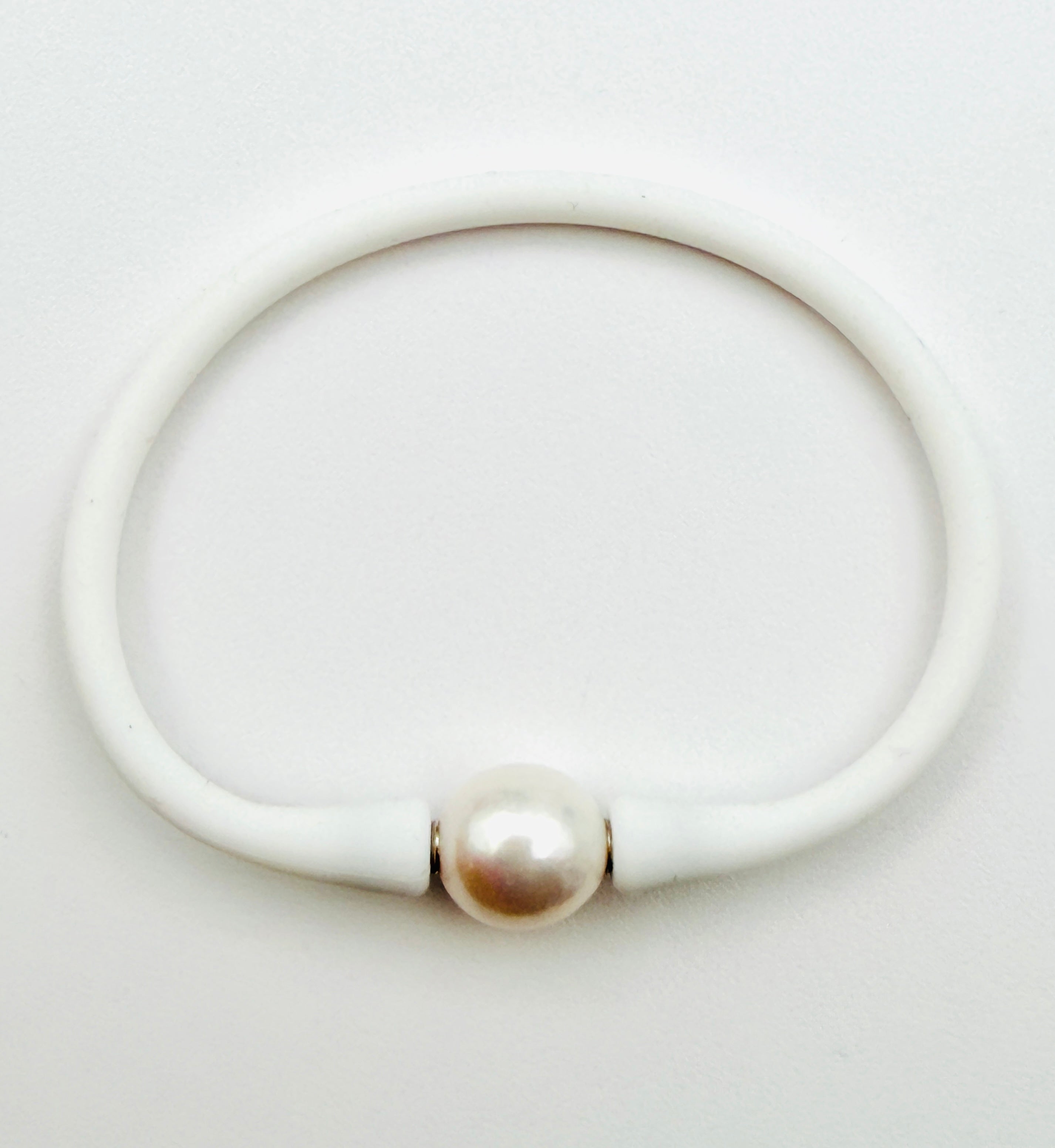 White Rubber Bracelet with White Freshwater Pearl , 7.25"